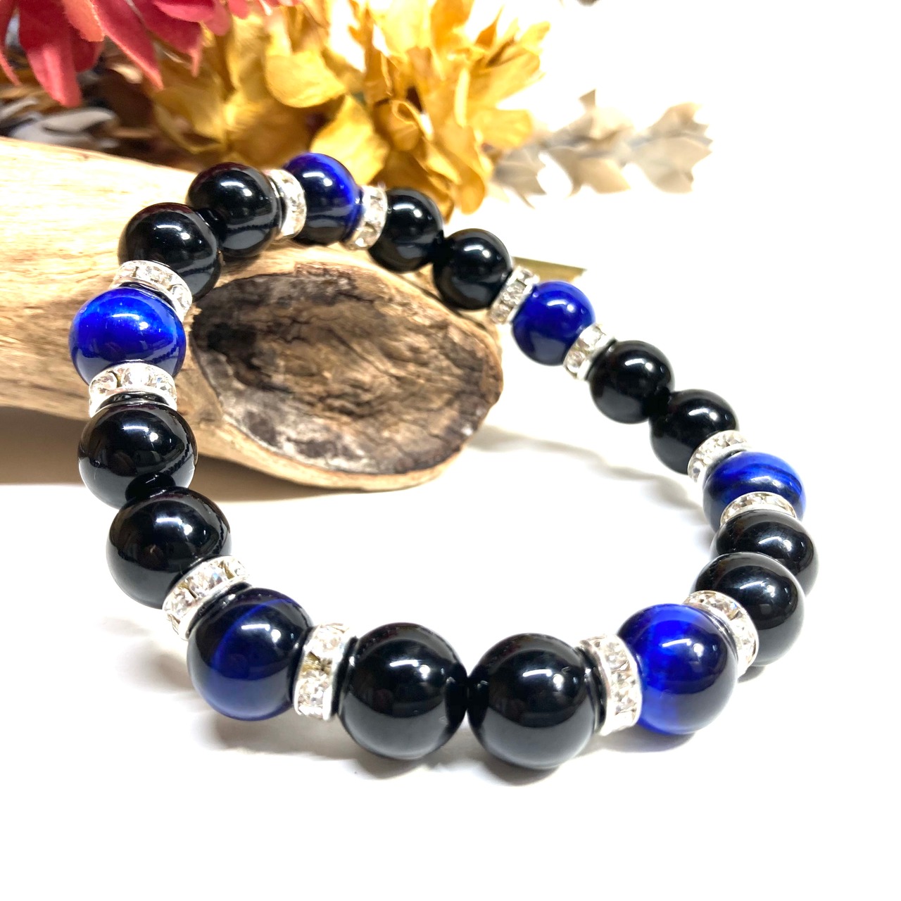こちらは、モリオンとブルータイガーアイを組み合わせたパワーストーンブレスレットです。間にはロンデルを挟み高級感あるデザインに仕上げております。石大きさは腕にも馴染みやすいように10mm玉で内径約18cm(伸可能)です。 数に限りがございますので気になる方はお早めにどうぞ。
