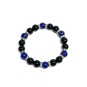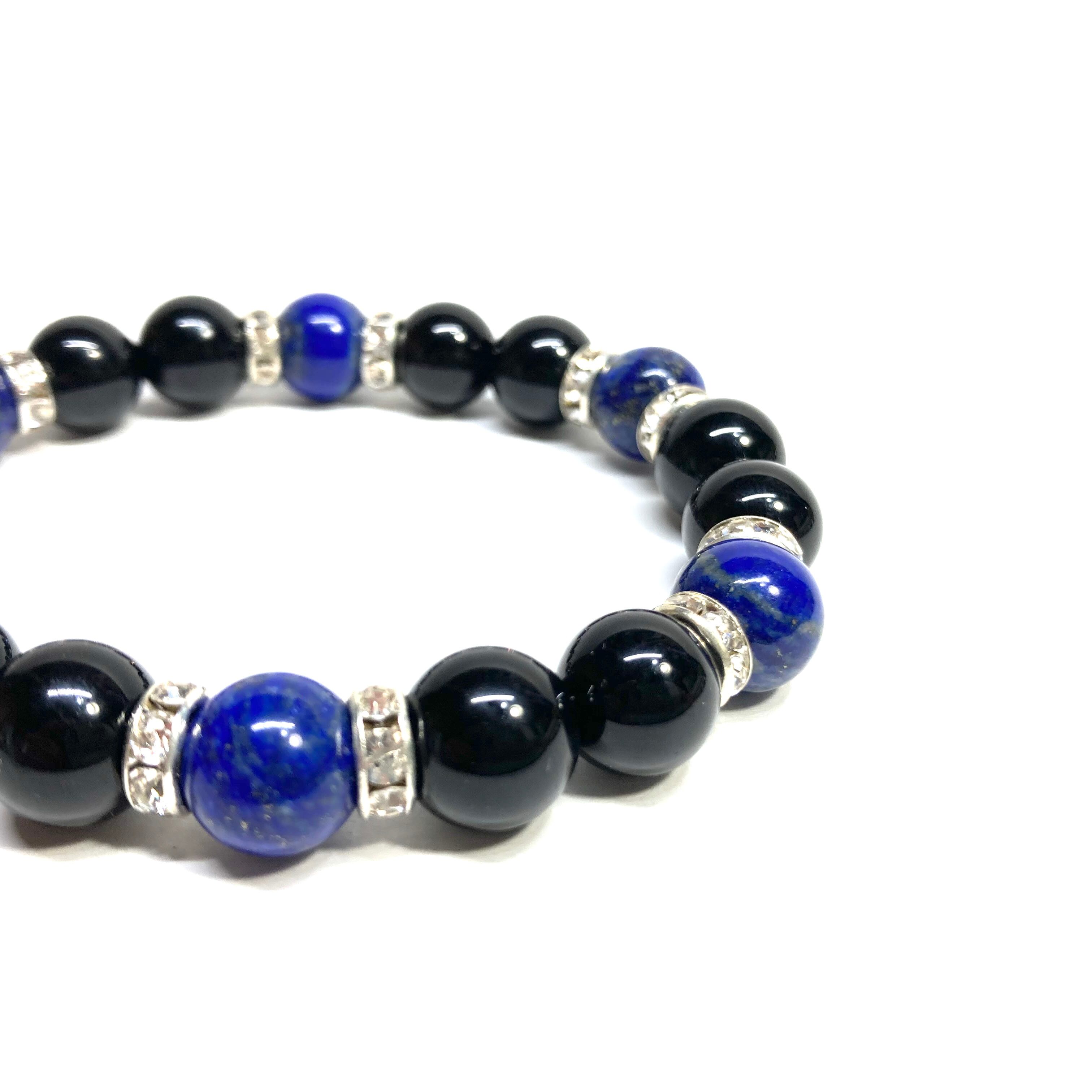 こちらは、モリオンとラピスラズリを組み合わせたパワーストーンブレスレットです。間にはロンデルを挟み高級感あるデザインに仕上げております。石大きさは腕にも馴染みやすいように10mm玉で内径約18cm(伸可能)です。 数に限りがございますので気になる方はお早めにどうぞ。