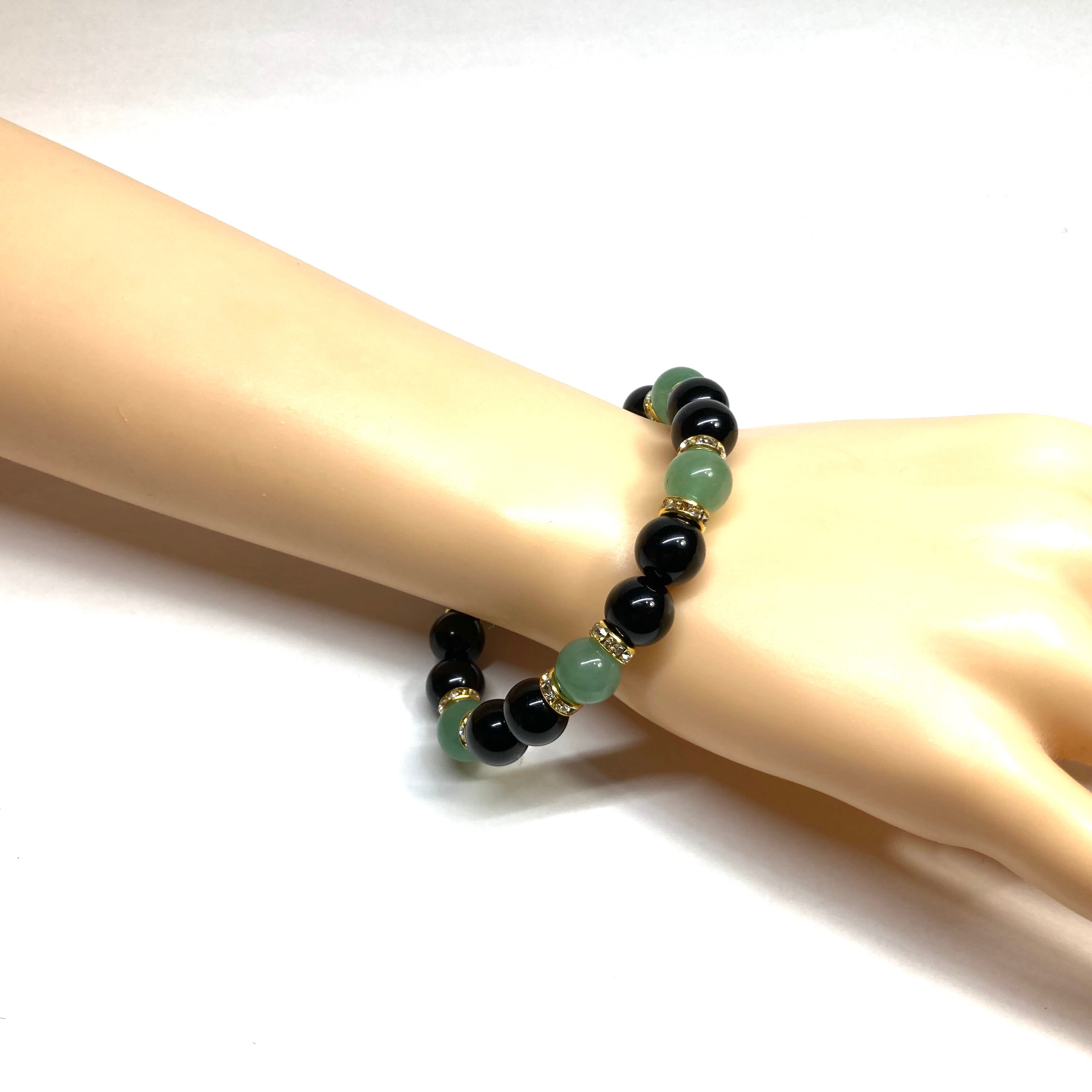 こちらは、モリオンとアベンチュリンを組み合わせたパワーストーンブレスレットです。間にはロンデルを挟み高級感あるデザインに仕上げております。石大きさは腕にも馴染みやすいように10mm玉で内径約18cm(伸可能)です。 数に限りがございますので気になる方はお早めにどうぞ。