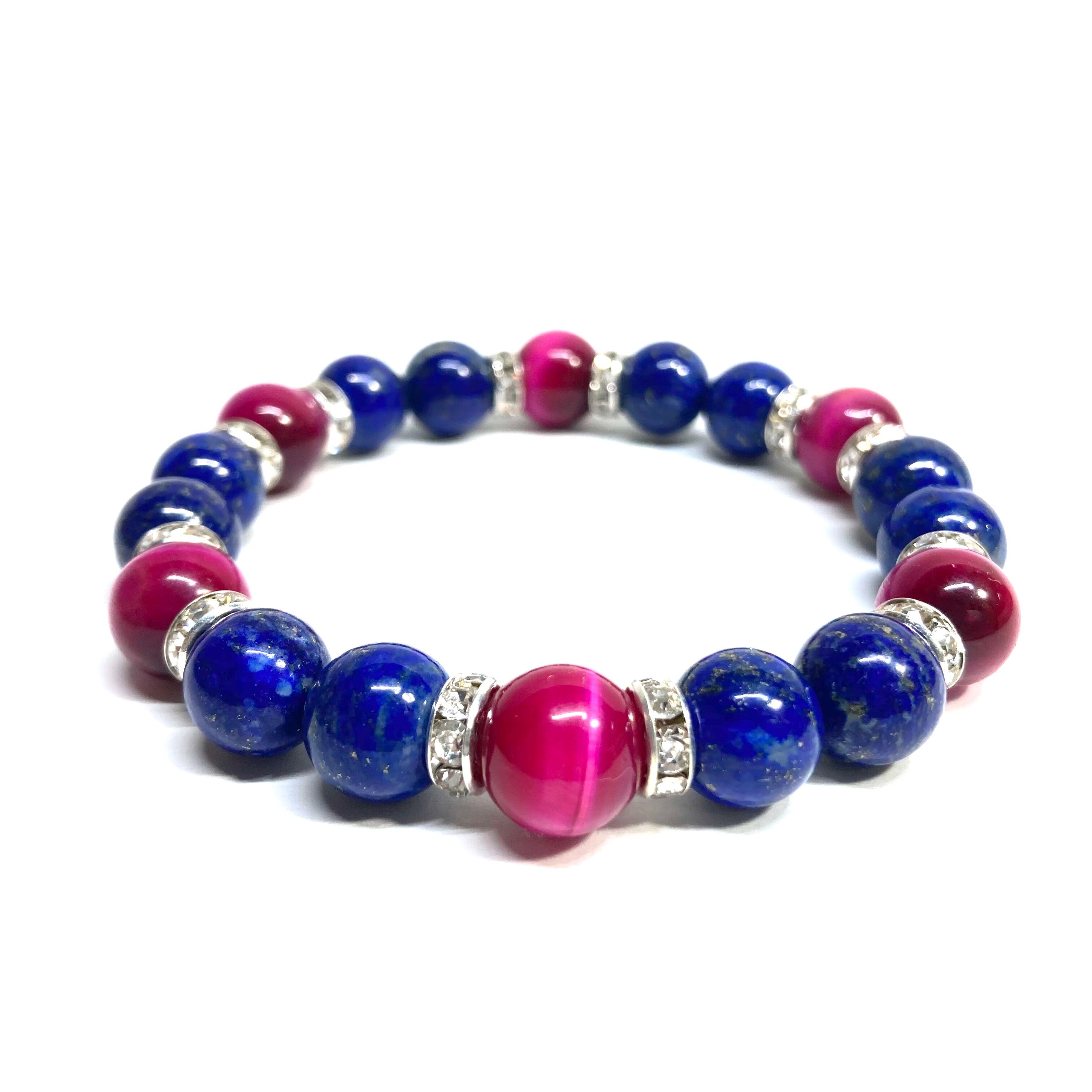 こちらは、ラピスラズリとピンクタイガーアイを組み合わせたパワーストーンブレスレットです。間にはロンデルを挟み高級感あるデザインに仕上げております。石大きさは腕にも馴染みやすいように10mm玉で内径約18cm(伸可能)です。 数に限りがございますので気になる方はお早めにどうぞ。