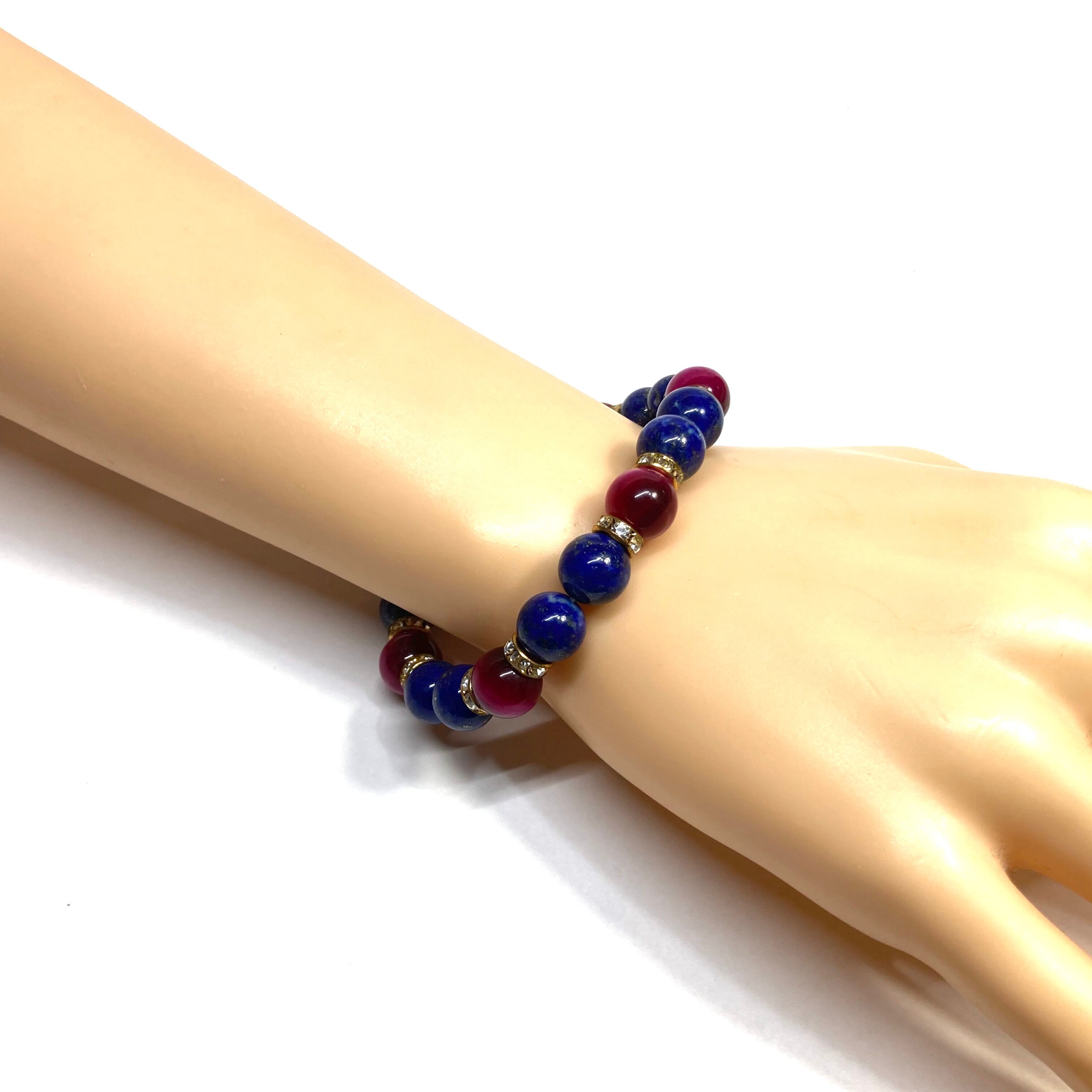 こちらは、ラピスラズリとピンクタイガーアイを組み合わせたパワーストーンブレスレットです。間にはロンデルを挟み高級感あるデザインに仕上げております。石大きさは腕にも馴染みやすいように10mm玉で内径約18cm(伸可能)です。 数に限りがございますので気になる方はお早めにどうぞ。