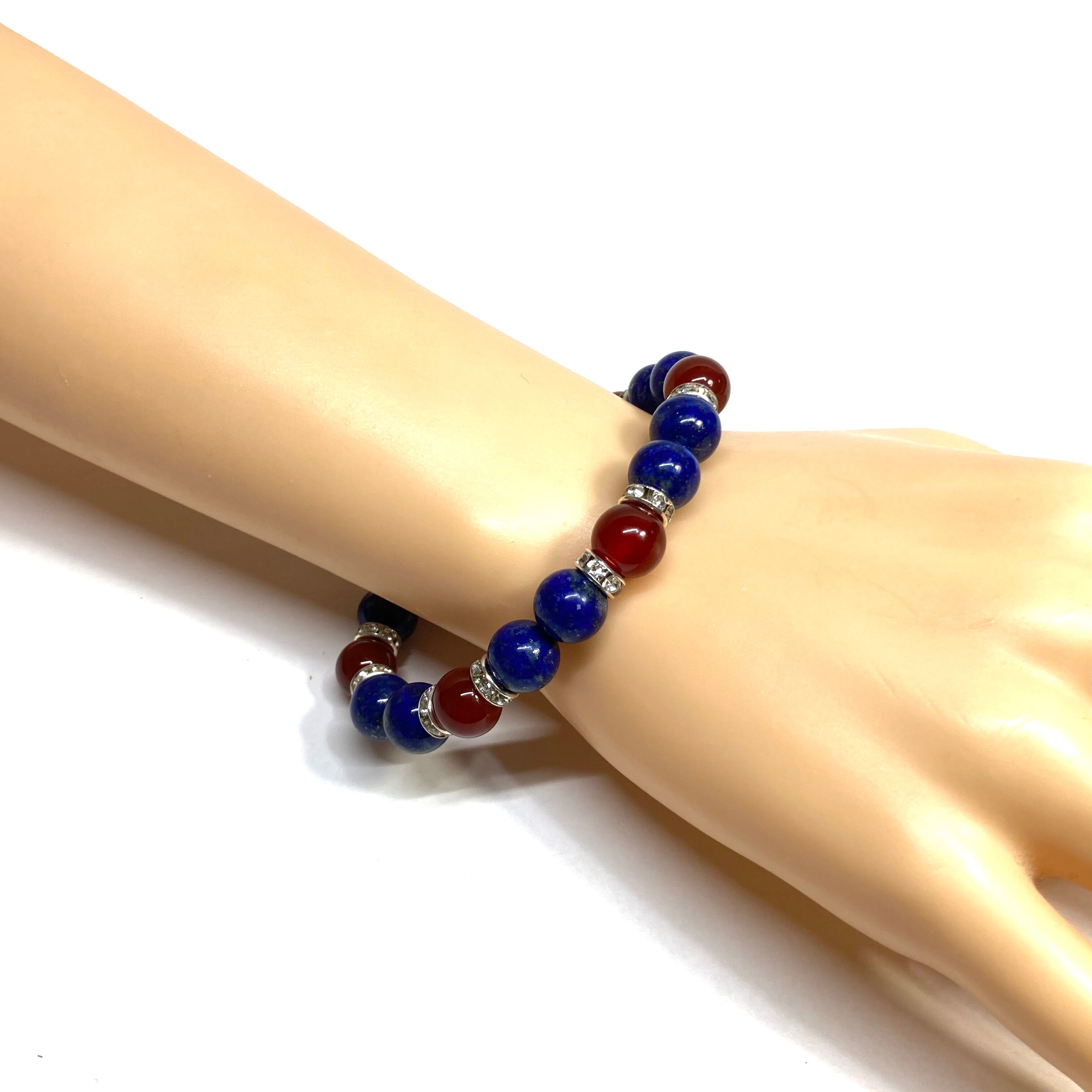 こちらは、ラピスラズリと赤瑪瑙を組み合わせたパワーストーンブレスレットです。間にはロンデルを挟み高級感あるデザインに仕上げております。石大きさは腕にも馴染みやすいように10mm玉で内径約18cm(伸可能)です。 数に限りがございますので気になる方はお早めにどうぞ。