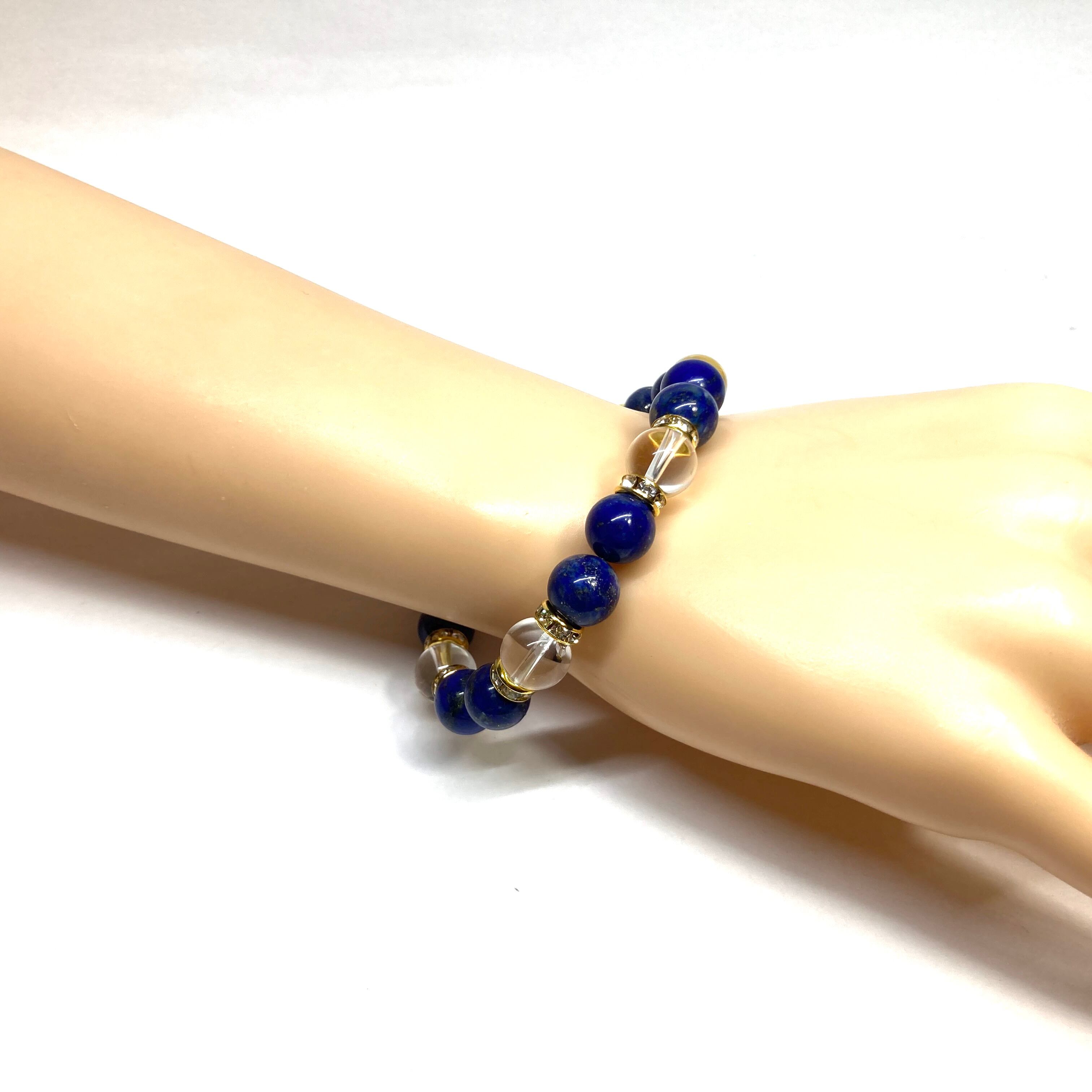 こちらは、ラピスラズリと水晶を組み合わせたパワーストーンブレスレットです。間にはロンデルを挟み高級感あるデザインに仕上げております。石大きさは腕にも馴染みやすいように10mm玉で内径約18cm(伸可能)です。 数に限りがございますので気になる方はお早めにどうぞ。