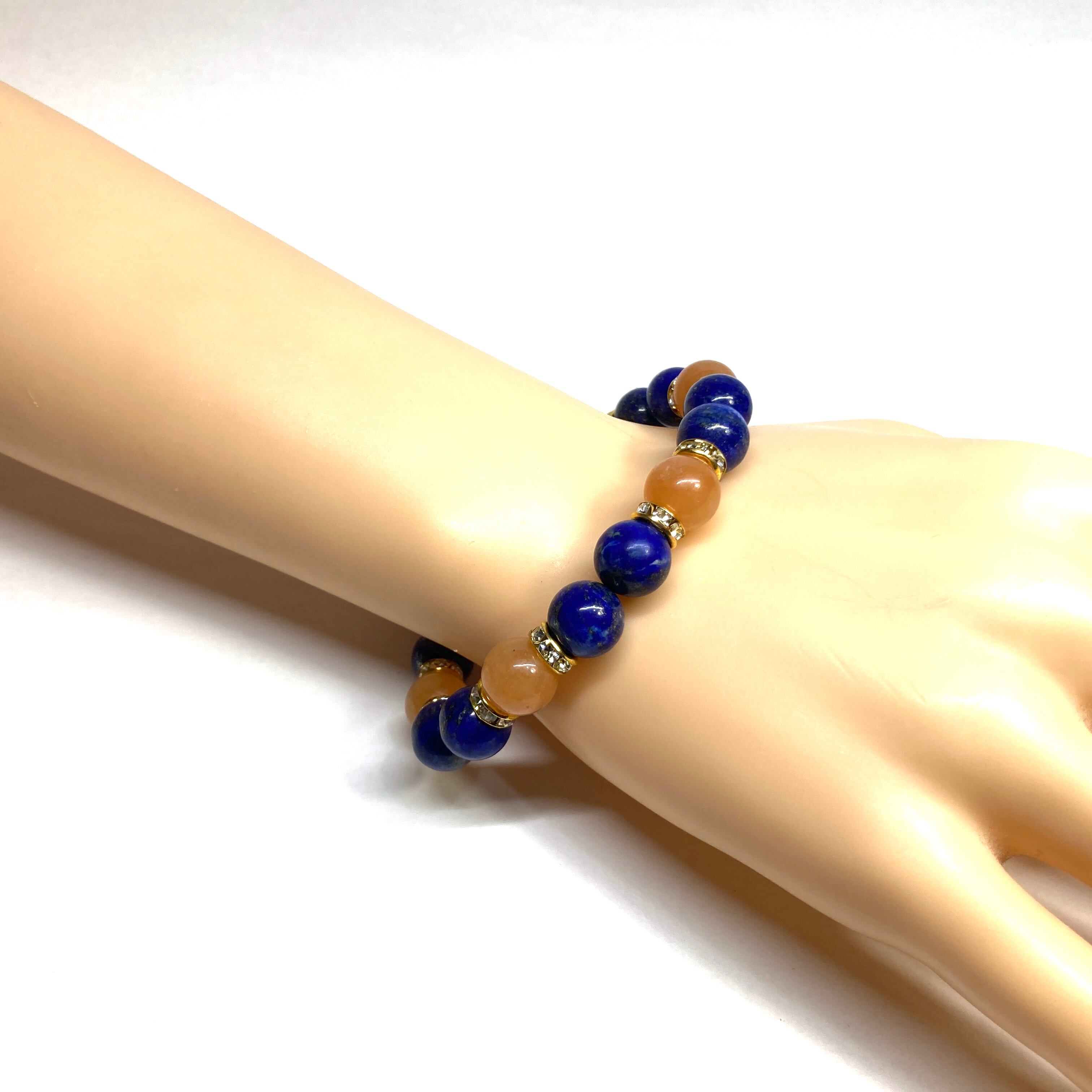 こちらは、ラピスラズリとレッドアベンチュリンを組み合わせたパワーストーンブレスレットです。間にはロンデルを挟み高級感あるデザインに仕上げております。石大きさは腕にも馴染みやすいように10mm玉で内径約18cm(伸可能)です。 数に限りがございますので気になる方はお早めにどうぞ。