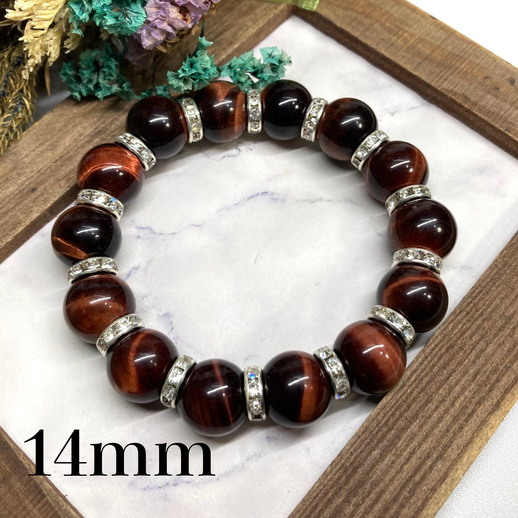 こちらは、14mm玉のレッドタイガーアイを使用した天然石ブレスレットです。シンプルなデザインですのでどんなコーディネートとも合わせ易いブレスレットです。石との間にはロンデルを挟み高級感を演出しています。石大きさはインパクトを与えてくれる大きさの14mm玉を使用しています。内周約17cmです。数に限りがございますので気になる方はお早めにどうぞ。