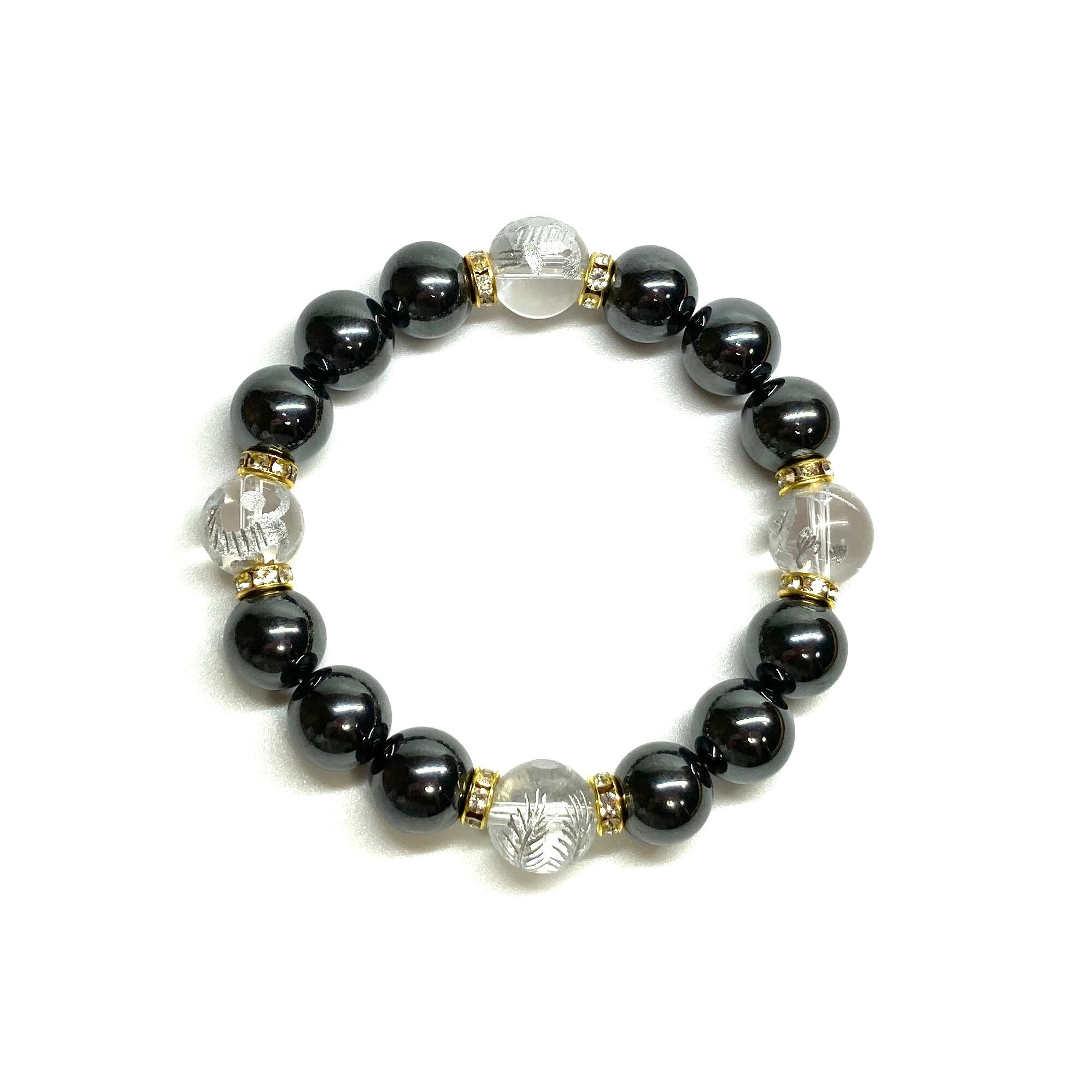 12mm 四神獣銀彫水晶×ヘマタイト パワーストーン ブレスレット天然石 運気上昇 開運 ☆ 健康運 厄払い お守り 青龍 白虎 玄武 朱雀 (ゴールド)メンズ・レディース 男性・女性 数珠ブレス 開運 ☆