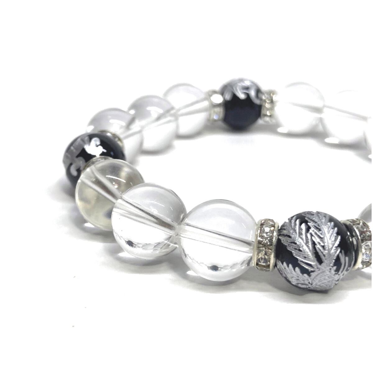 12mm 四神獣銀彫オニキス×水晶 パワーストーン ブレスレット天然石 運気上昇 開運 ☆ 金運 恋愛運 お守り 青龍 白虎 玄武 朱雀 4月誕生石 (シルバー)メンズ・レディース 男性・女性 数珠ブレス 開運 ☆