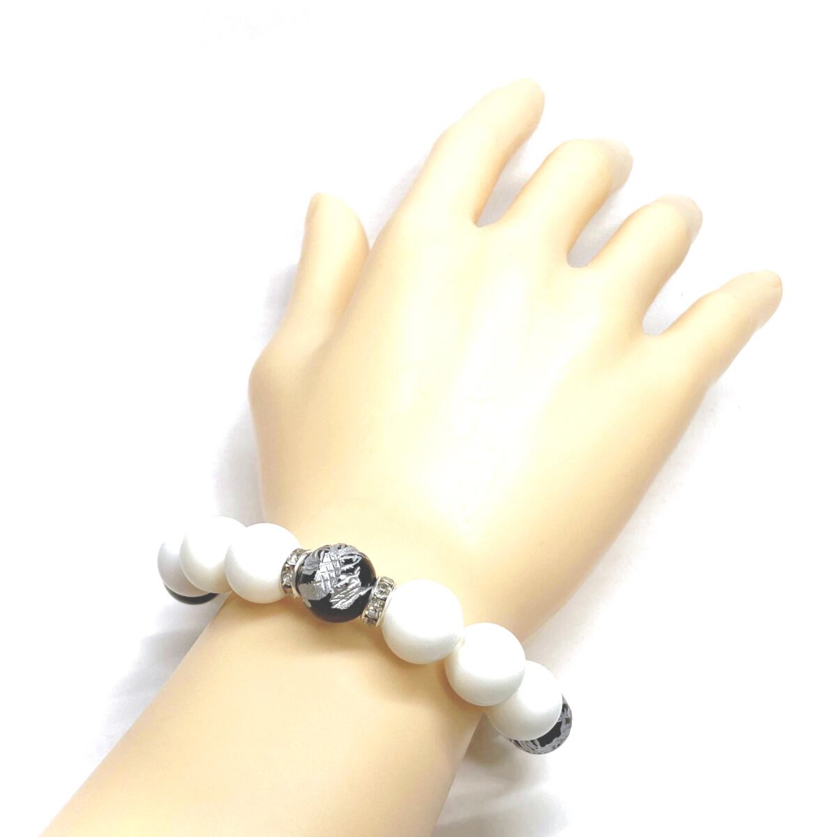 12mm 四神獣銀彫オニキス×ホワイトオニキス パワーストーン ブレスレット天然石 運気上昇 開運 ☆ 厄払い お守り 青龍 白虎 玄武 朱雀 (シルバー)メンズ・レディース 男性・女性 数珠ブレス 開運 ☆