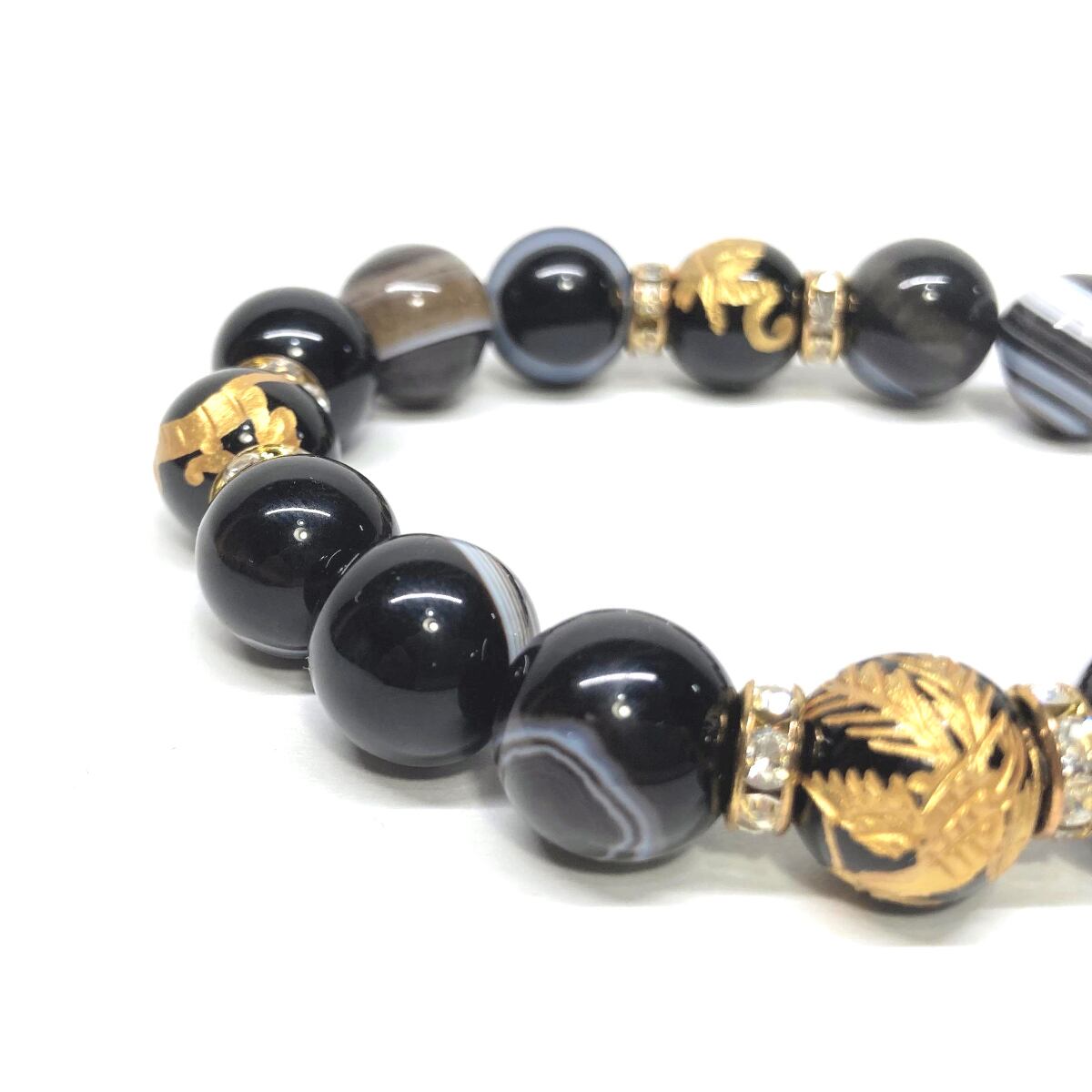 12mm 四神獣金彫オニキス×チベットアゲート(天眼石) パワーストーン ブレスレット天然石 運気上昇 金運 ギャンブル運 お守り (ゴールド)メンズ・レディース 男性・女性 数珠ブレス 開運 ☆