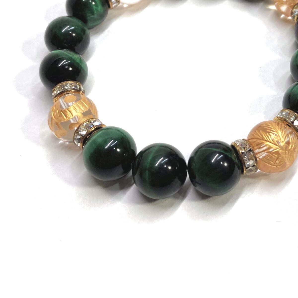 ご覧頂いているブレスレットは、四神獣金彫水晶とグリーンタイガーアイを組み合わせたブレスレット。守り神である四神とパワーストーンの組み合わせで運気の流れを引き寄せる強運ブレスレットです。シンプルなデザインで男女問わず、年齢問わずご使用頂けるデザインなっております。シンプルなデザインは日常のアクセントとして、仕事やビジネスカジュアル、パーティーや特別なイベントなど様々なシーン活用できます。また、ちょっと贈り物にも最適なブレスレットになっております。四神獣を身につけて厄災から身を守り、多くの運気を呼び込まれてください。
