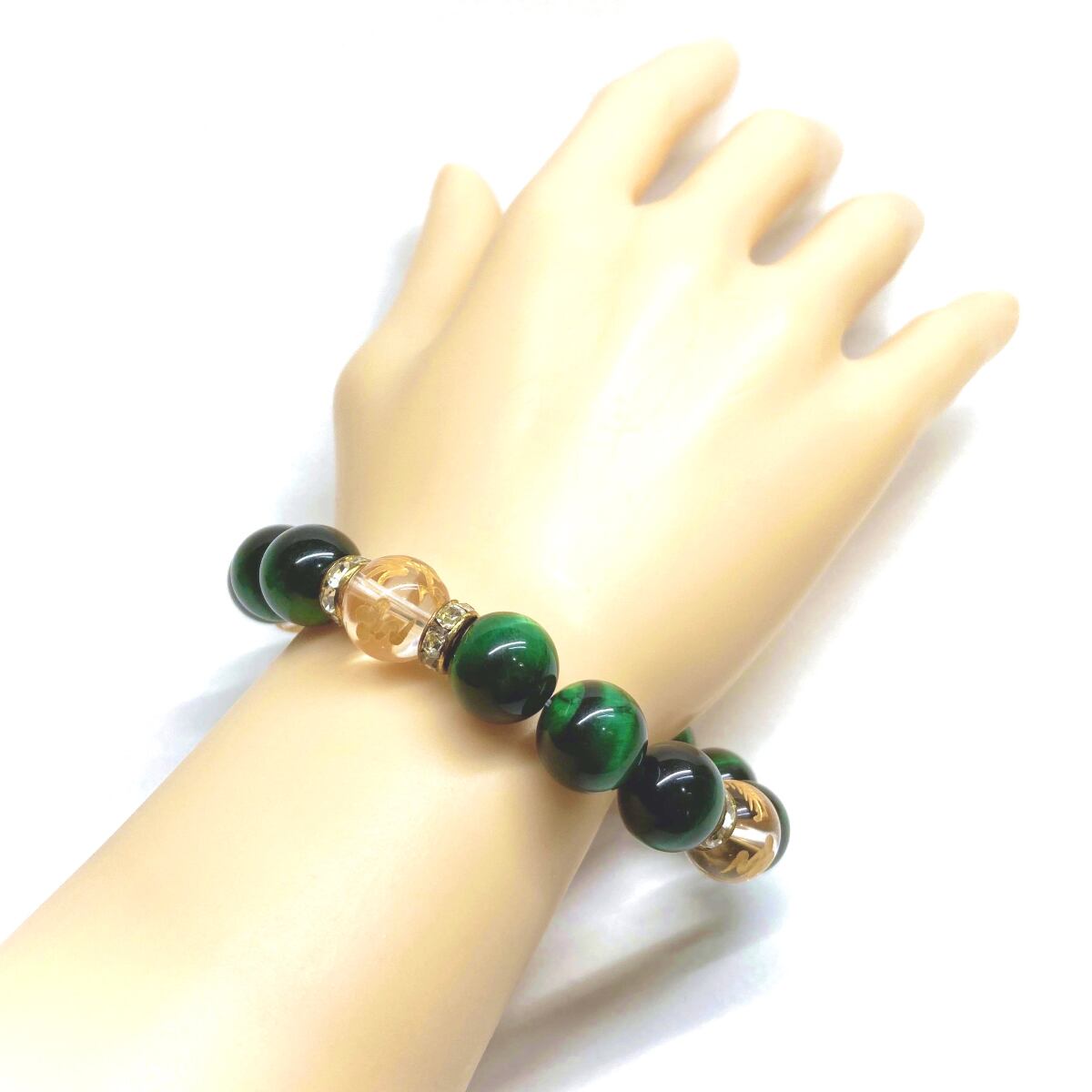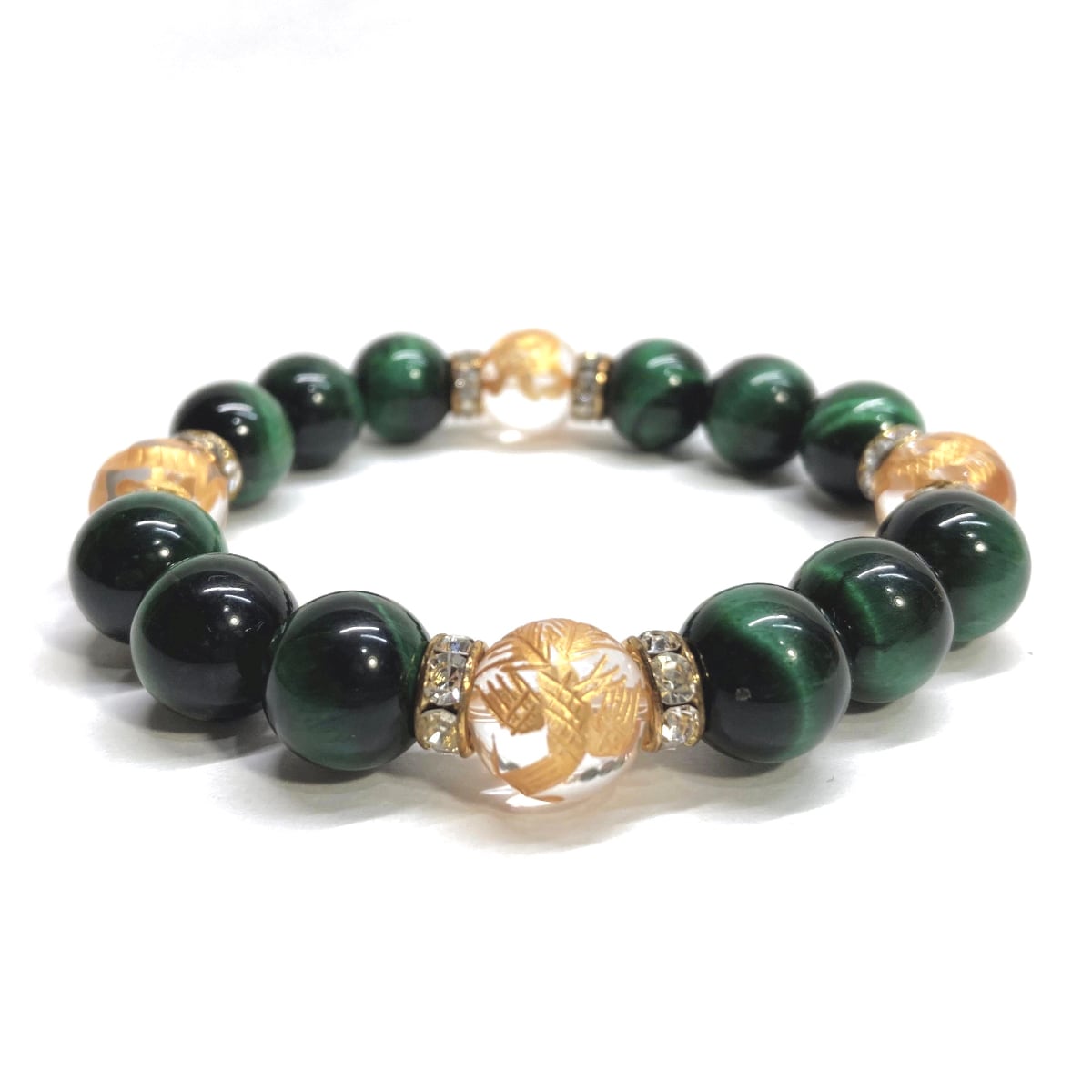 12mm 四神獣金彫水晶×グリーンタイガーアイ パワーストーン ブレスレット天然石 運気上昇 金運 健康運 お守り 青龍 白虎 玄武 朱雀 (ゴールド)メンズ・レディース 男性・女性 数珠ブレス 開運 ☆