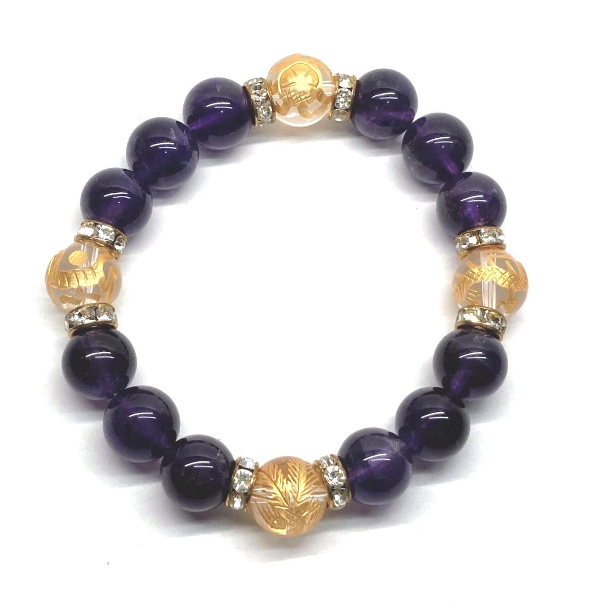 12mm 四神獣金彫水晶×アメジスト パワーストーン ブレスレット天然石 運気上昇 開運 ☆ 恋愛運 お守り 青龍 白虎 玄武 朱雀 2月誕生石(ゴールド)メンズ・レディース 男性・女性 数珠ブレス 開運 ☆
