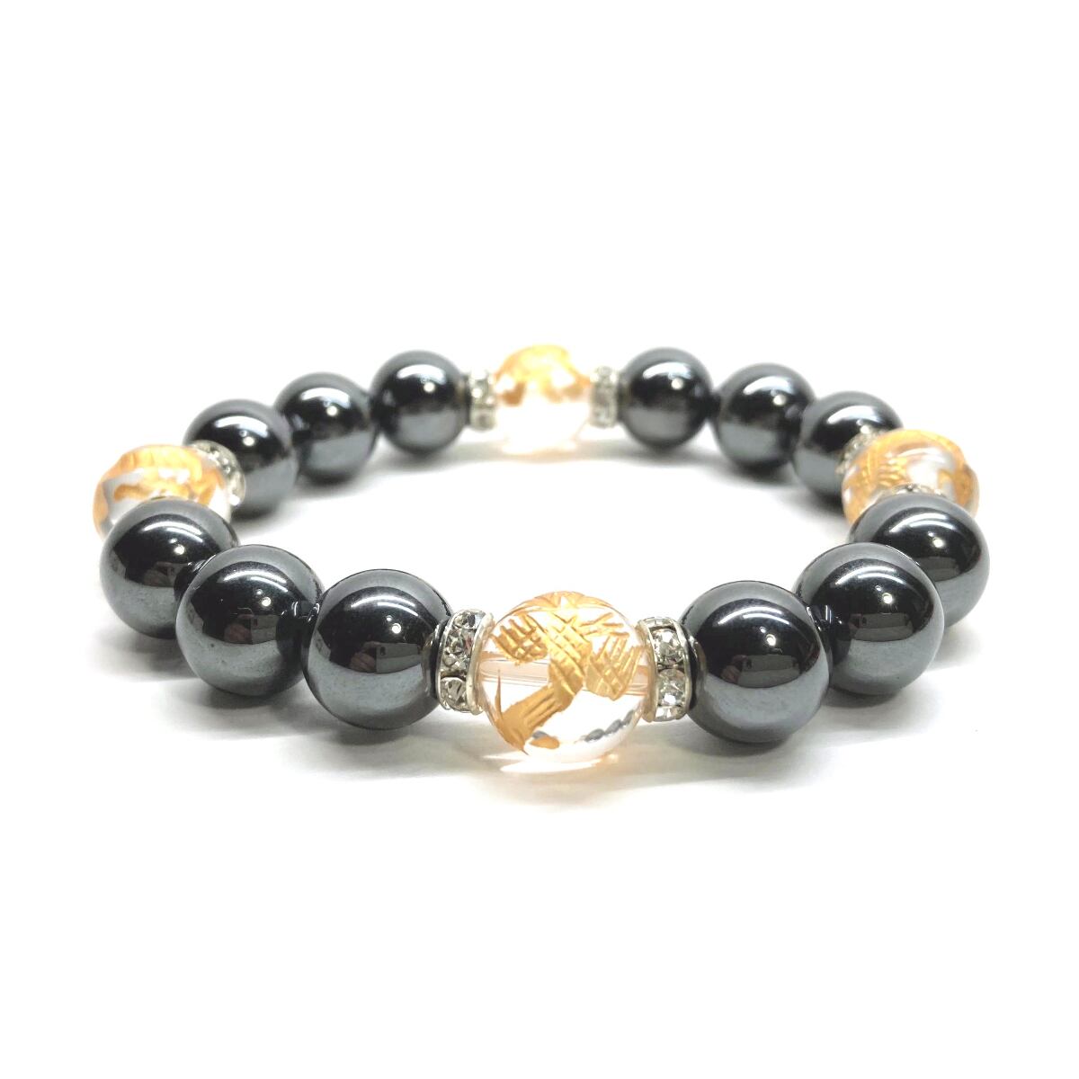 12mm 四神獣金彫水晶×ヘマタイト パワーストーン ブレスレット天然石 運気上昇 開運 ☆ 健康運 厄払い お守り 青龍 白虎 玄武 朱雀 (シルバー)メンズ・レディース 男性・女性 数珠ブレス 開運 ☆