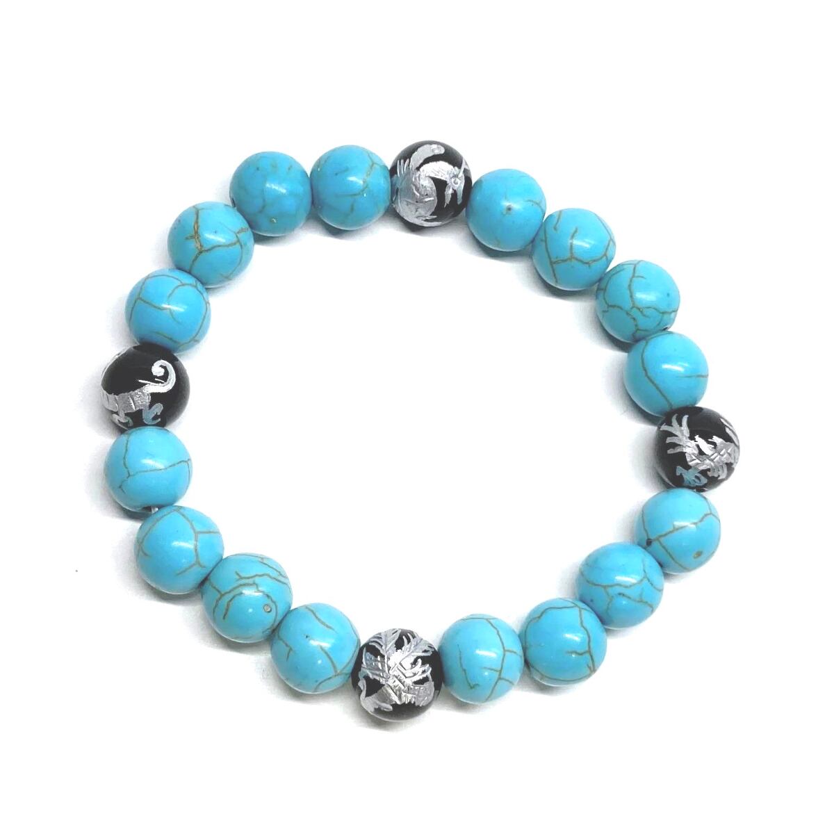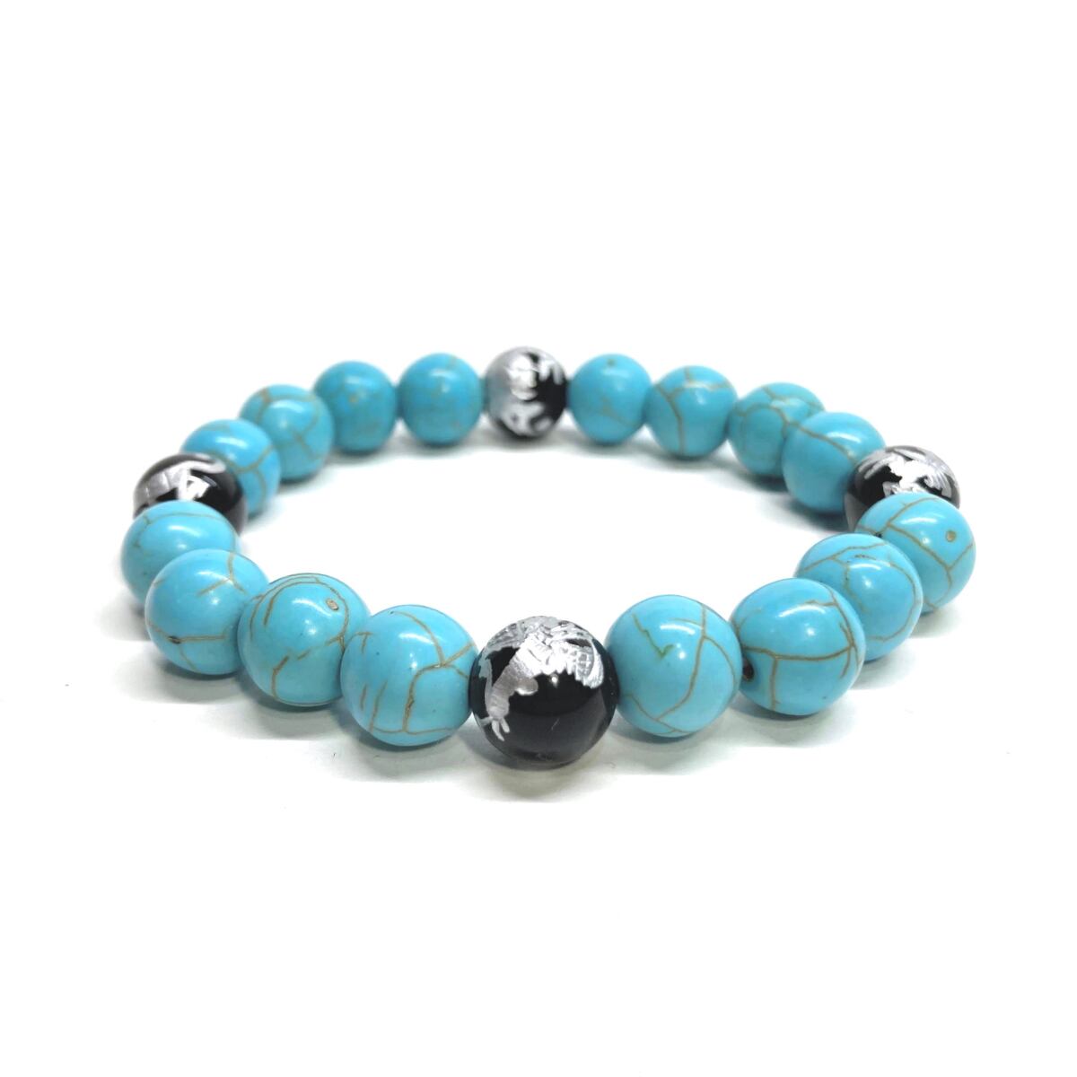 10mm 四神獣銀彫オニキス×ターコイズ パワーストーン ブレスレット天然石 運気上昇 開運 金運 恋愛運 お守り 青龍 白虎 玄武 朱雀 #2 ☆