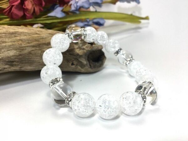 こちらは、12mm玉のクラック水晶と水晶を使用した天然石ブレスレットです。石との間にはロンデルを挟み高級感を演出しています。シンプルなデザインですのでどんなコーディネートとも合わせ易いブレスレットです。石大きさは12mm玉です。内周約18cmです。気になる方は是非この機会にどうぞ。
