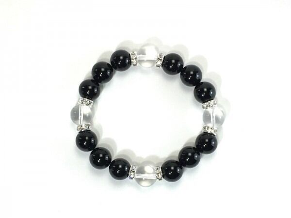 こちらは、12mm玉のオニキスと水晶を使用した天然石ブレスレットです。石との間にはロンデルを挟み高級感を演出しています。シンプルなデザインですのでどんなコーディネートとも合わせ易いブレスレットです。石大きさは12mm玉です。内周約18cmです。気になる方は是非この機会にどうぞ。