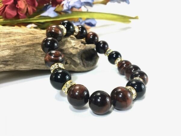 こちらは、12mm玉のレッドタイガーアイとオニキスを使用した天然石ブレスレットです。石との間にはロンデルを挟み高級感を演出しています。シンプルなデザインですのでどんなコーディネートとも合わせ易いブレスレットです。石大きさは12mm玉です。内周約18cmです。気になる方は是非この機会にどうぞ。
