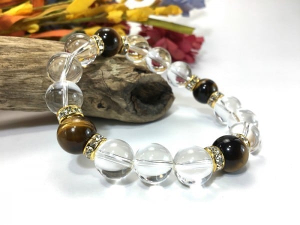 こちらは、12mm玉の水晶とタイガーアイを使用した天然石ブレスレットです。石との間にはロンデルを挟み高級感を演出しています。シンプルなデザインですのでどんなコーディネートとも合わせ易いブレスレットです。石大きさは12mm玉です。内周約18cmです。気になる方は是非この機会にどうぞ。