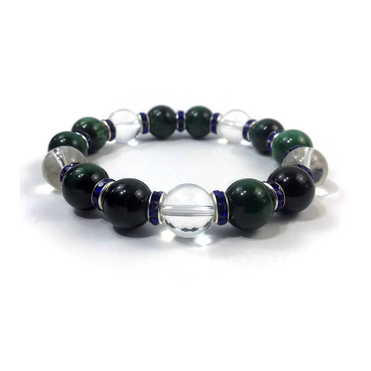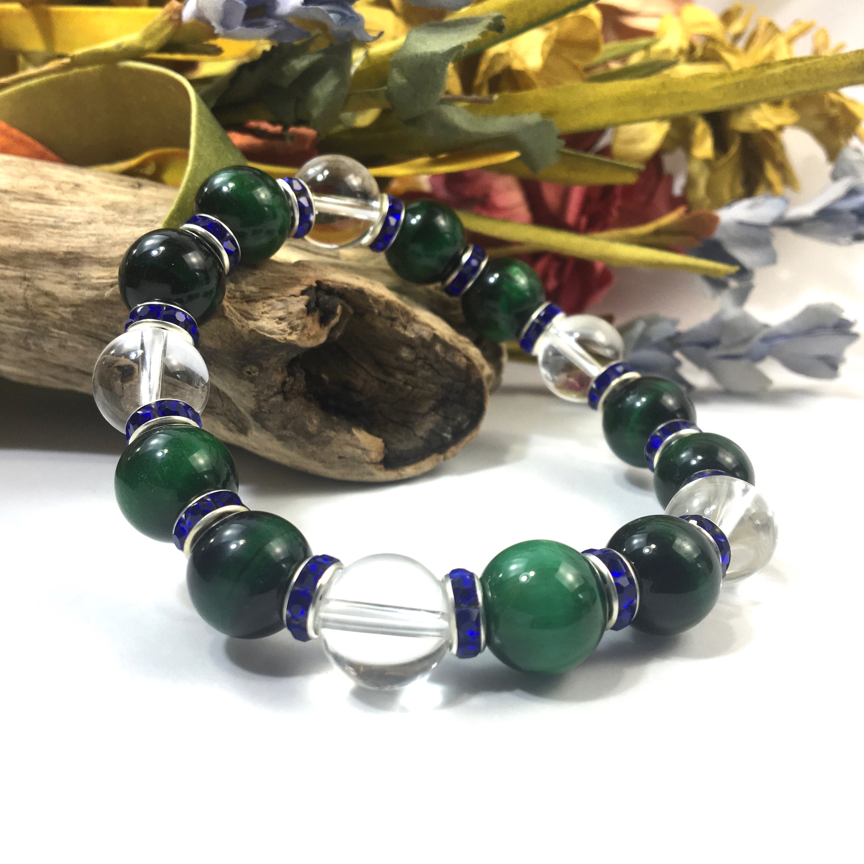 グリーンタイガーアイ&水晶 パワーストーン ブレスレット 12mm (ダークブルー)メンズ・レディース 男性・女性 数珠ブレス 開運 ☆