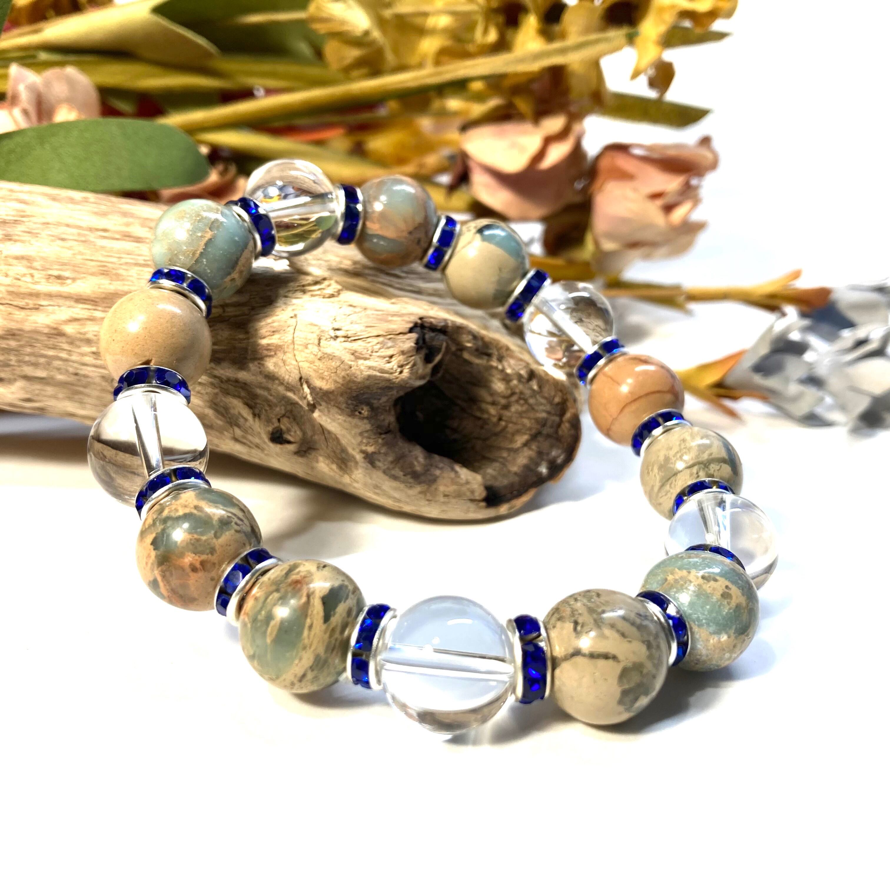 インプレッションストーン&水晶 パワーストーン ブレスレット 12mmダークブルー)メンズ・レディース 男性・女性 数珠ブレス 開運 ☆