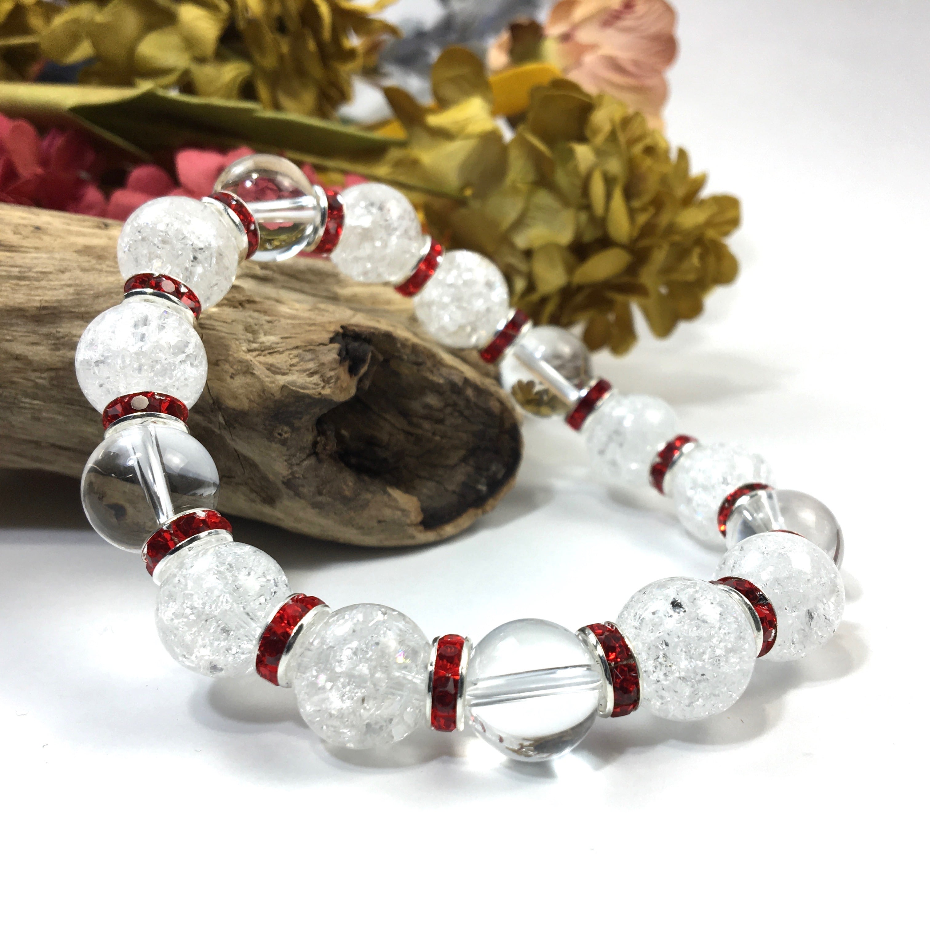 クラック水晶&水晶 パワーストーン ブレスレット 天然石 12mm (レッド)メンズ・レディース 男性・女性 数珠ブレス 開運 ☆