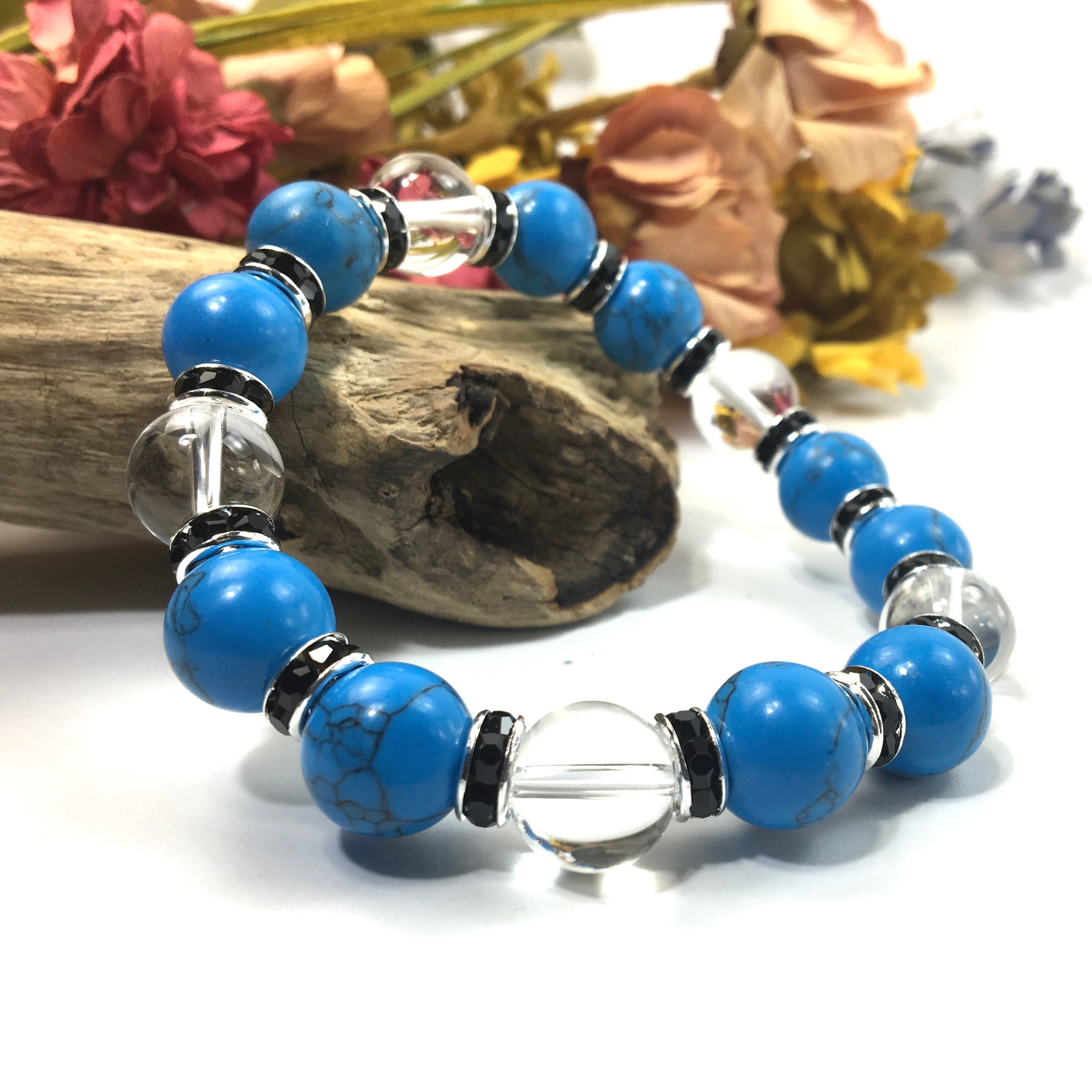 ターコイズ&水晶 パワーストーン ブレスレット 12mm (ブラック)メンズ・レディース 男性・女性 数珠ブレス 開運 ☆