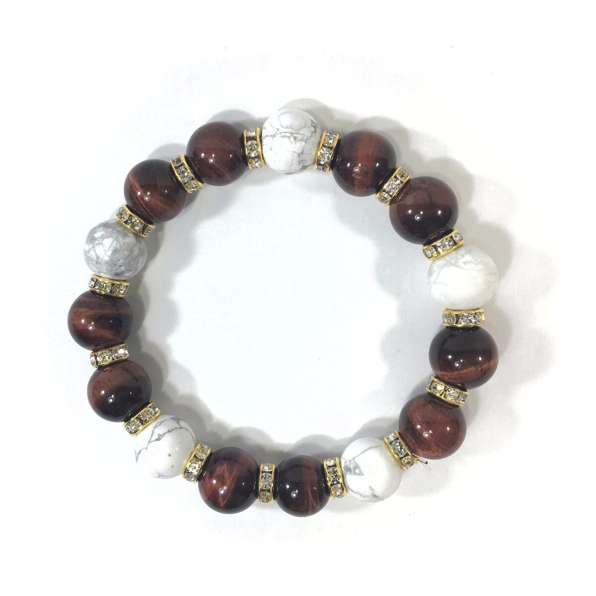 こちらは、レッドタイガーアイとハウライトを組み合わせたパワーストーンブレスレットです。間にはロンデルを挟み高級感あるデザインに仕上げております。石大きさは12mm玉を使用して内周約18cmです。気になる方は是非この機会にどうぞ。