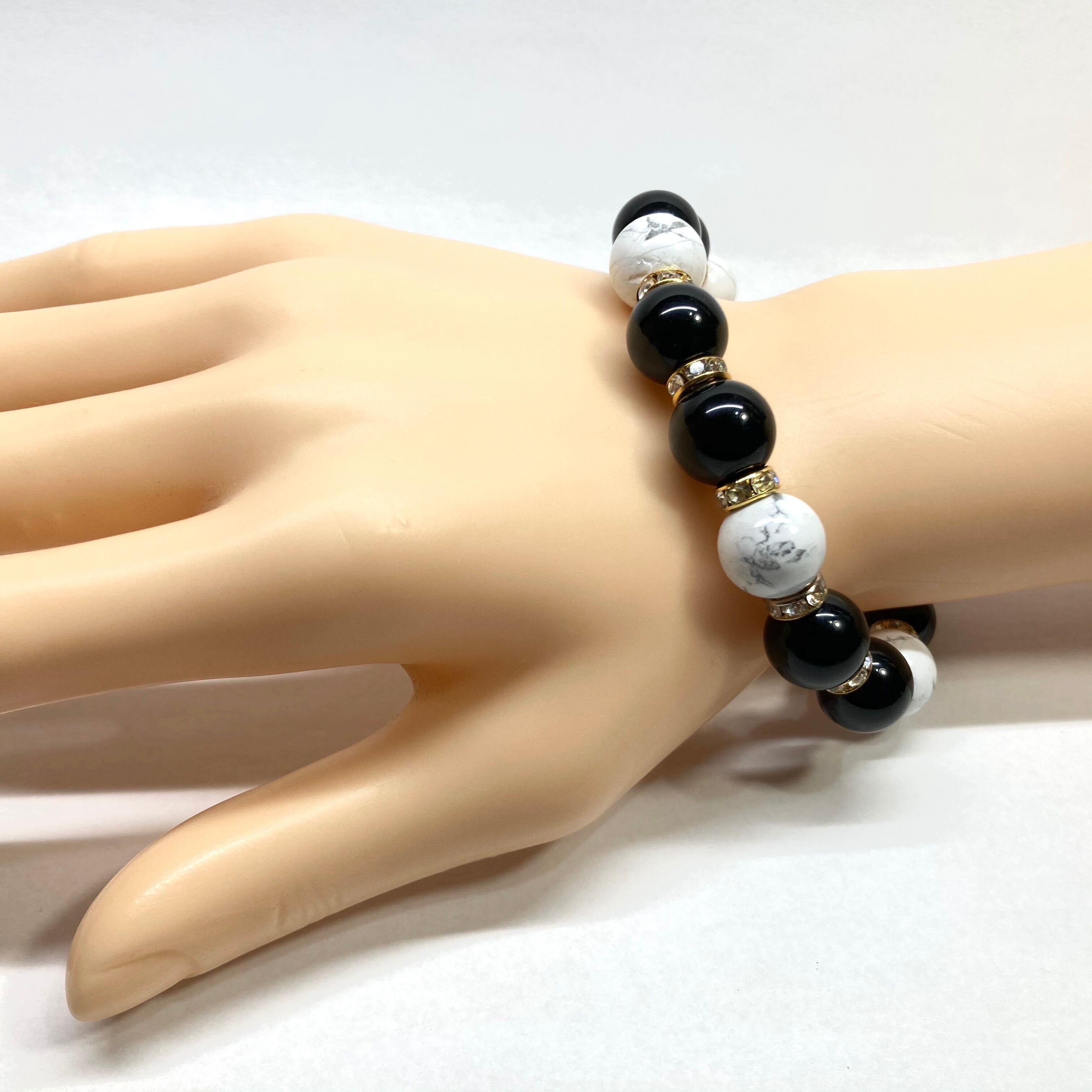 こちらは、12mm玉のモリオンとハウライトを組み合わせたパワーストーンブレスレットです。間にはロンデルを挟み高級感あるデザインに仕上げております。石大きさは12mm玉を使用して内周約18cmです。数に限りがございますので気になる方はお早めにどうぞ。