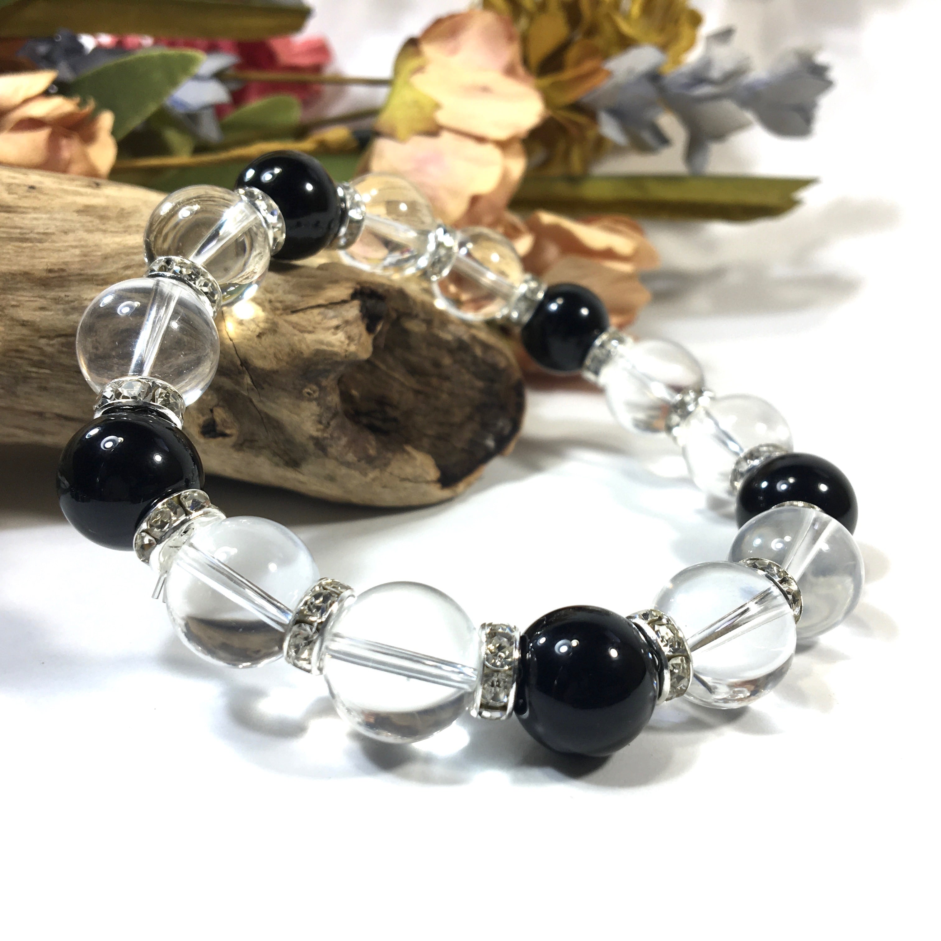 水晶&オニキス パワーストーン ブレスレット 天然石ブレス 12mm (シルバー)メンズ・レディース 男性・女性 数珠ブレス 開運 ☆