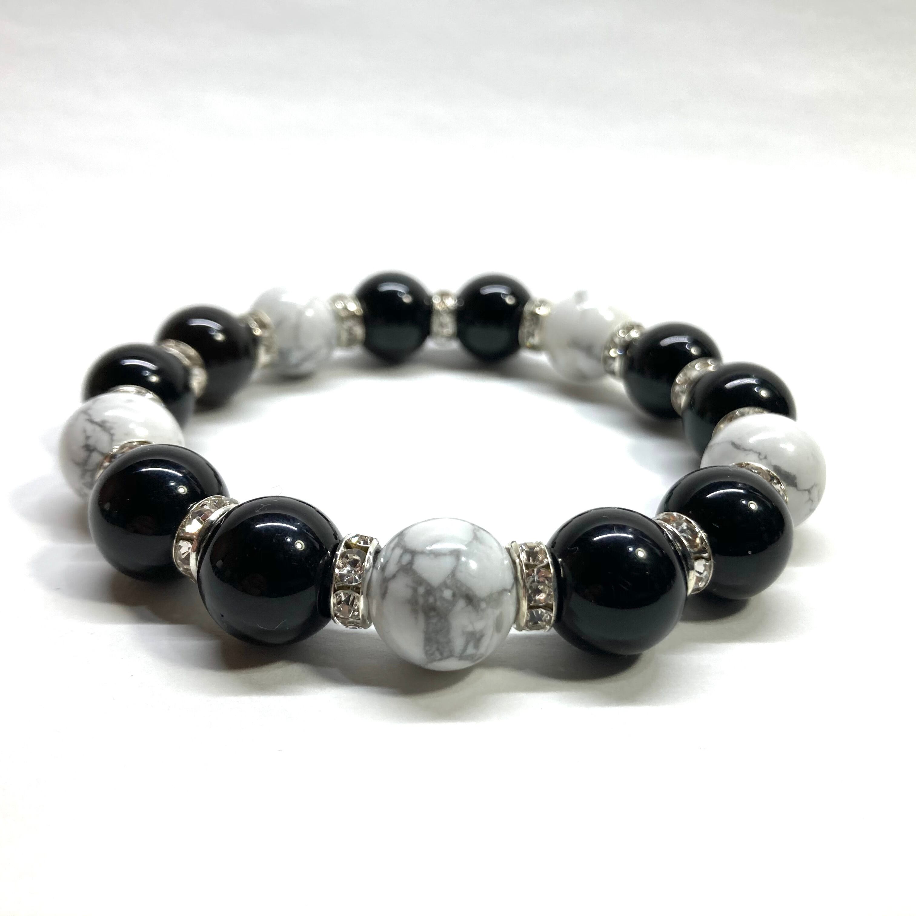 こちらは、12mm玉のモリオンとハウライトを組み合わせたパワーストーンブレスレットです。間にはロンデルを挟み高級感あるデザインに仕上げております。石大きさは12mm玉を使用して内周約18cmです。数に限りがございますので気になる方はお早めにどうぞ。