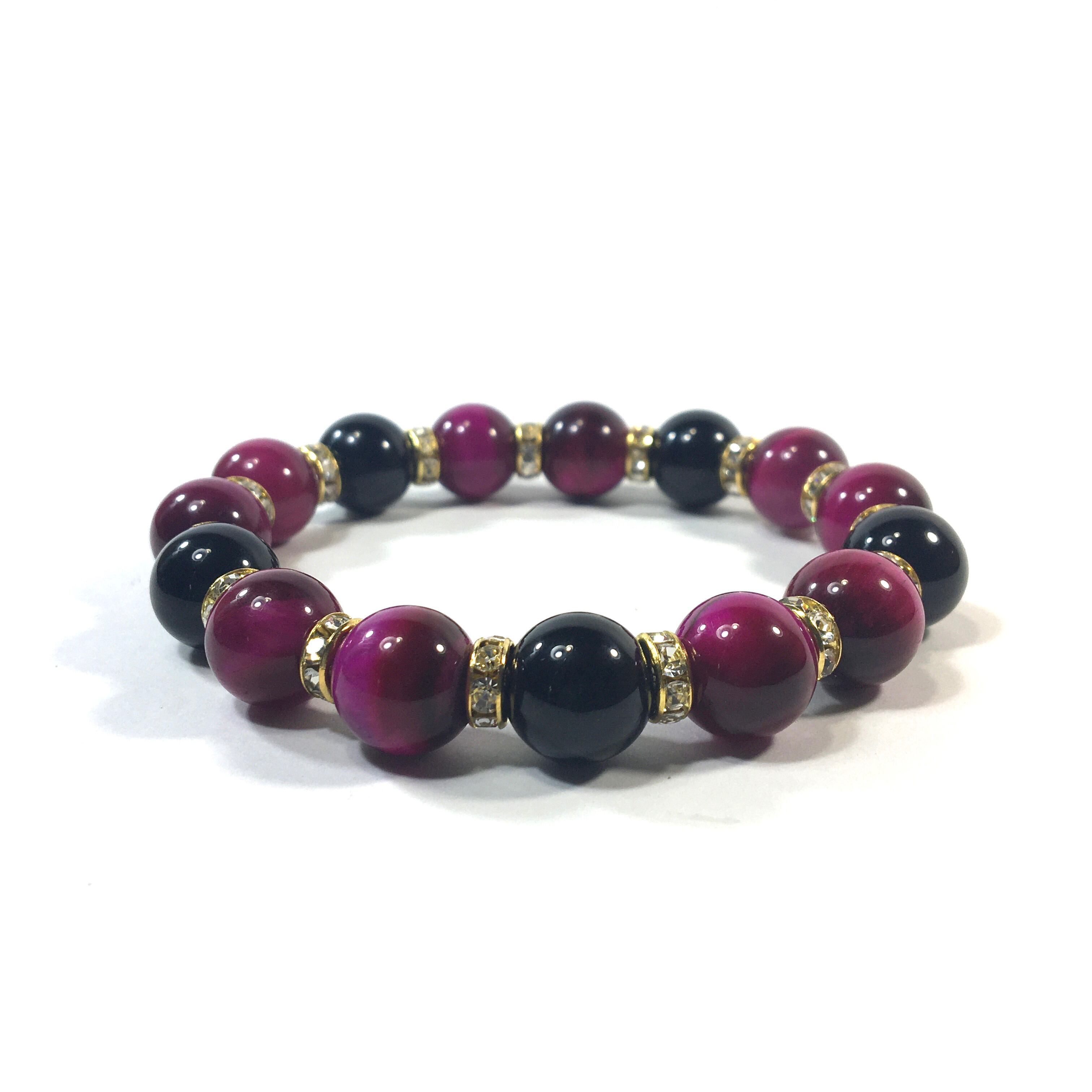 こちらは、ピンクタイガーアイとオニキスを組み合わせたパワーストーンブレスレットです。間にはロンデルを挟み高級感あるデザインに仕上げております。石大きさは12mm玉を使用して内周約18cmです。気になる方は是非この機会にどうぞ。