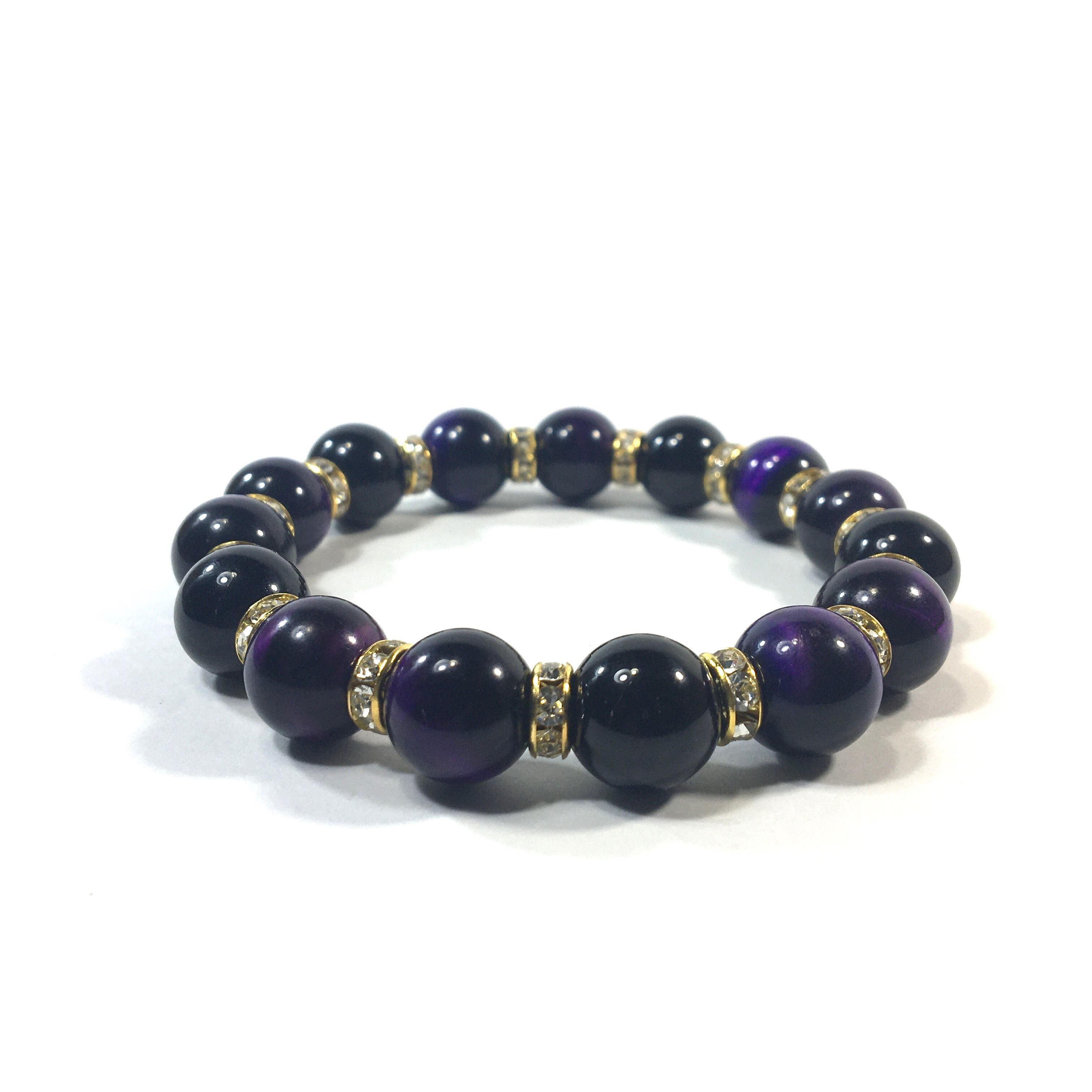 こちらは、パープルタイガーアイとオニキスを組み合わせたパワーストーンブレスレットです。間にはロンデルを挟み高級感あるデザインに仕上げております。石大きさは12mm玉を使用して内周約18cmです。気になる方は是非この機会にどうぞ。