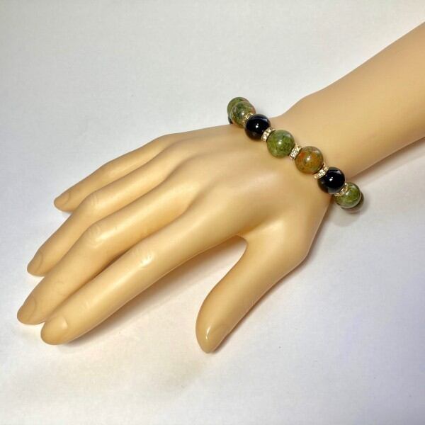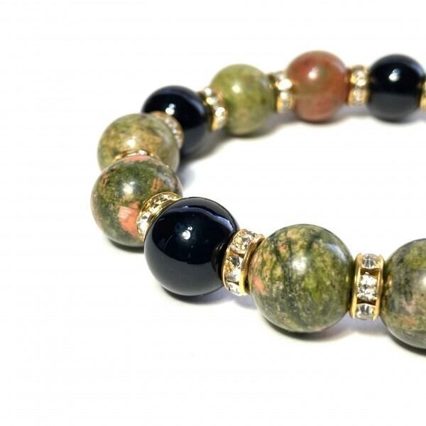 こちらは、ユナカイトとオニキスを組み合わせたパワーストーンブレスレットです。間にはロンデルを挟み高級感あるデザインに仕上げております。石大きさは12mm玉を使用して内径約18cmです。気になる方は是非この機会にどうぞ。