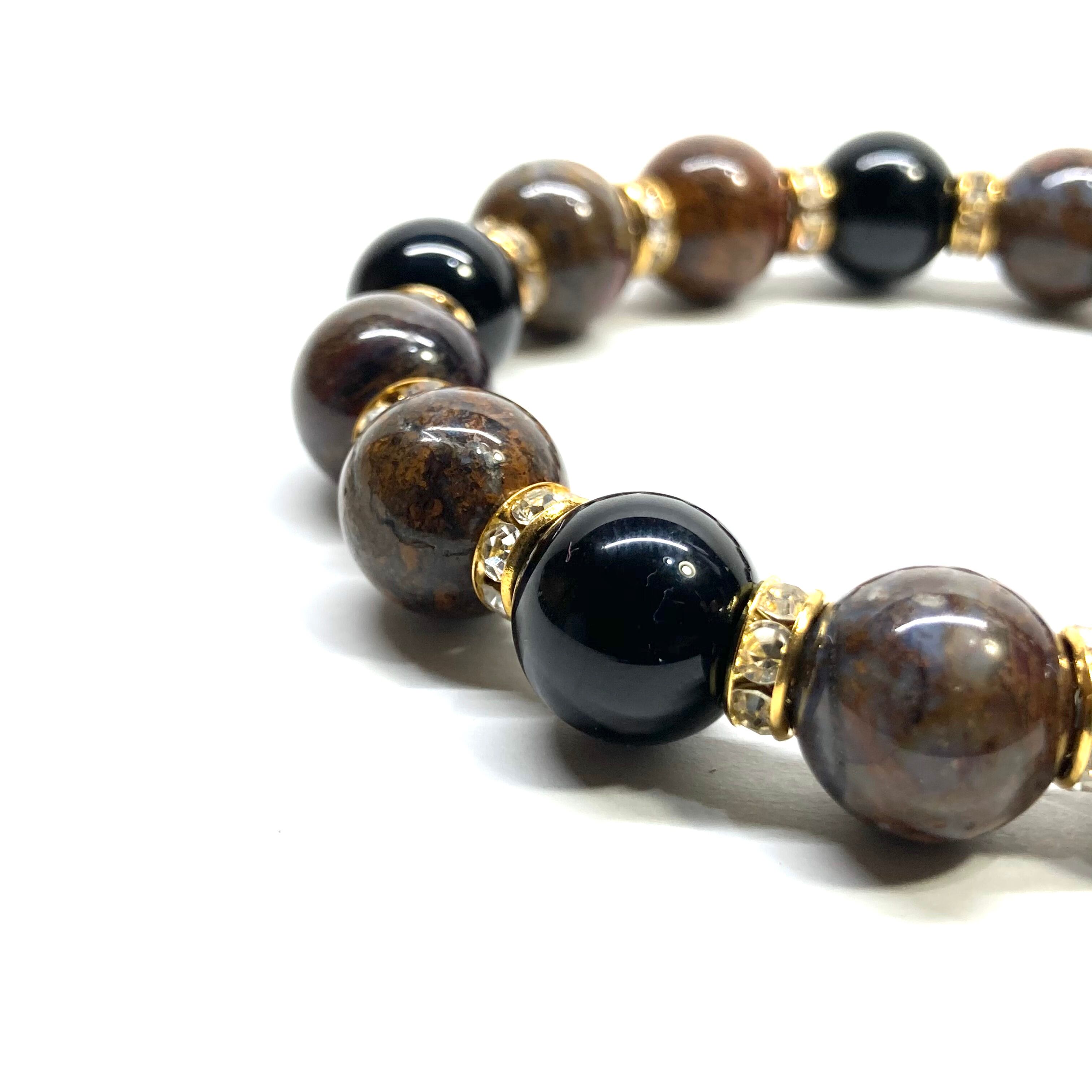 こちらは、10mm玉のピーターサイトとオニキスを組み合わせたパワーストーンブレスレットです。間にはロンデルを挟み高級感あるデザインに仕上げております。石大きさは12mm玉を使用して内径約18cmです。数に限りがございますので気になる方はお早めにどうぞ。