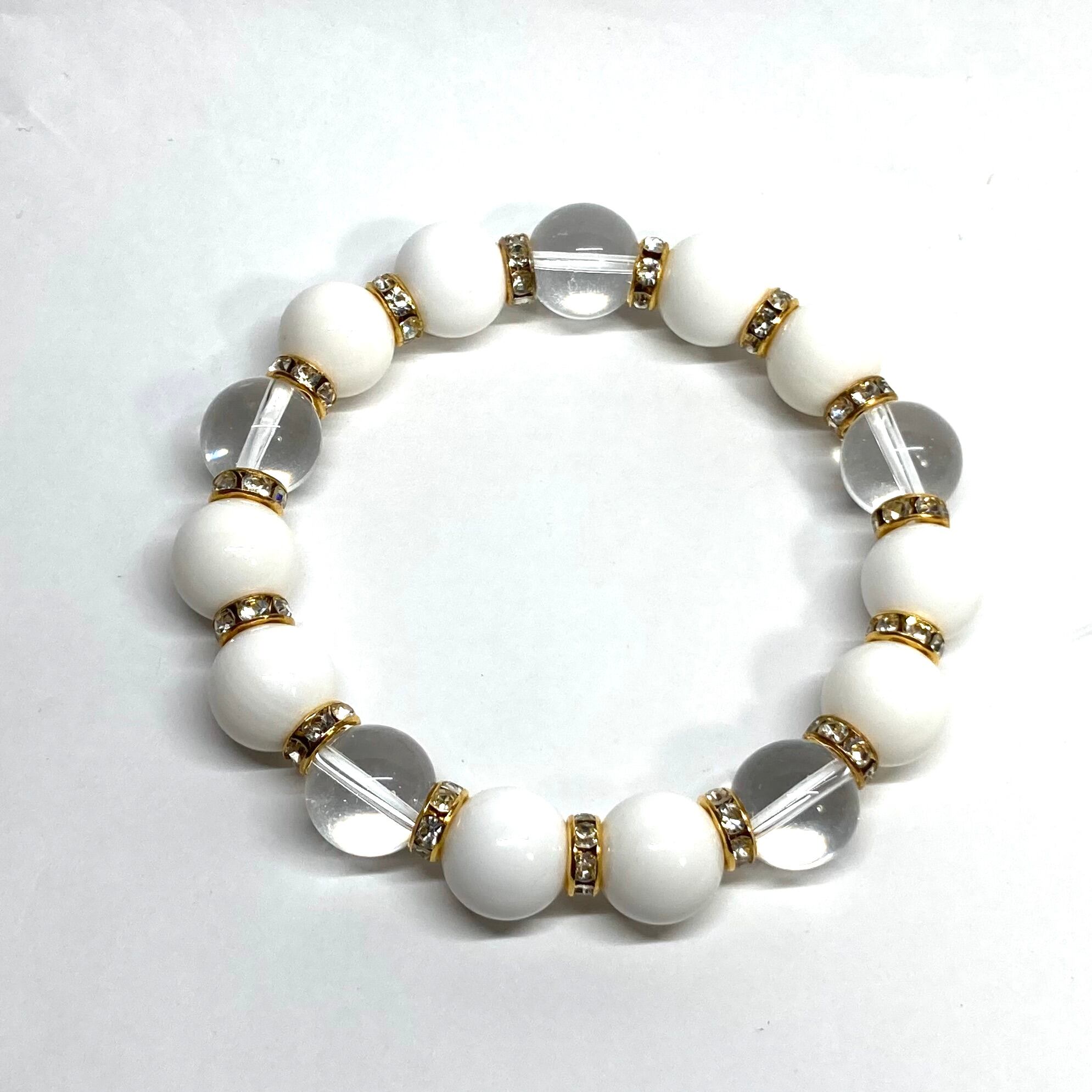 こちらは、ホワイトオニキスと水晶を組み合わせたパワーストーンブレスレットです。間にはロンデルを挟み高級感あるデザインに仕上げております。程よくインパクトがある12mm玉を使用して内周約18cmです。数に限りがございますので気になる方はお早めにどうぞ。