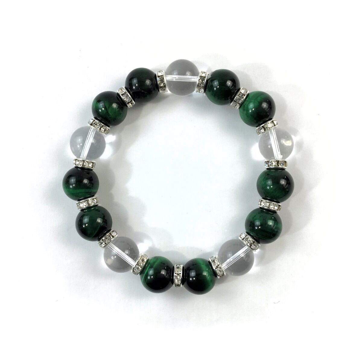 グリーンタイガーアイ&水晶 パワーストーン ブレスレット 12mm (シルバー)メンズ・レディース 男性・女性 数珠ブレス 開運 ☆