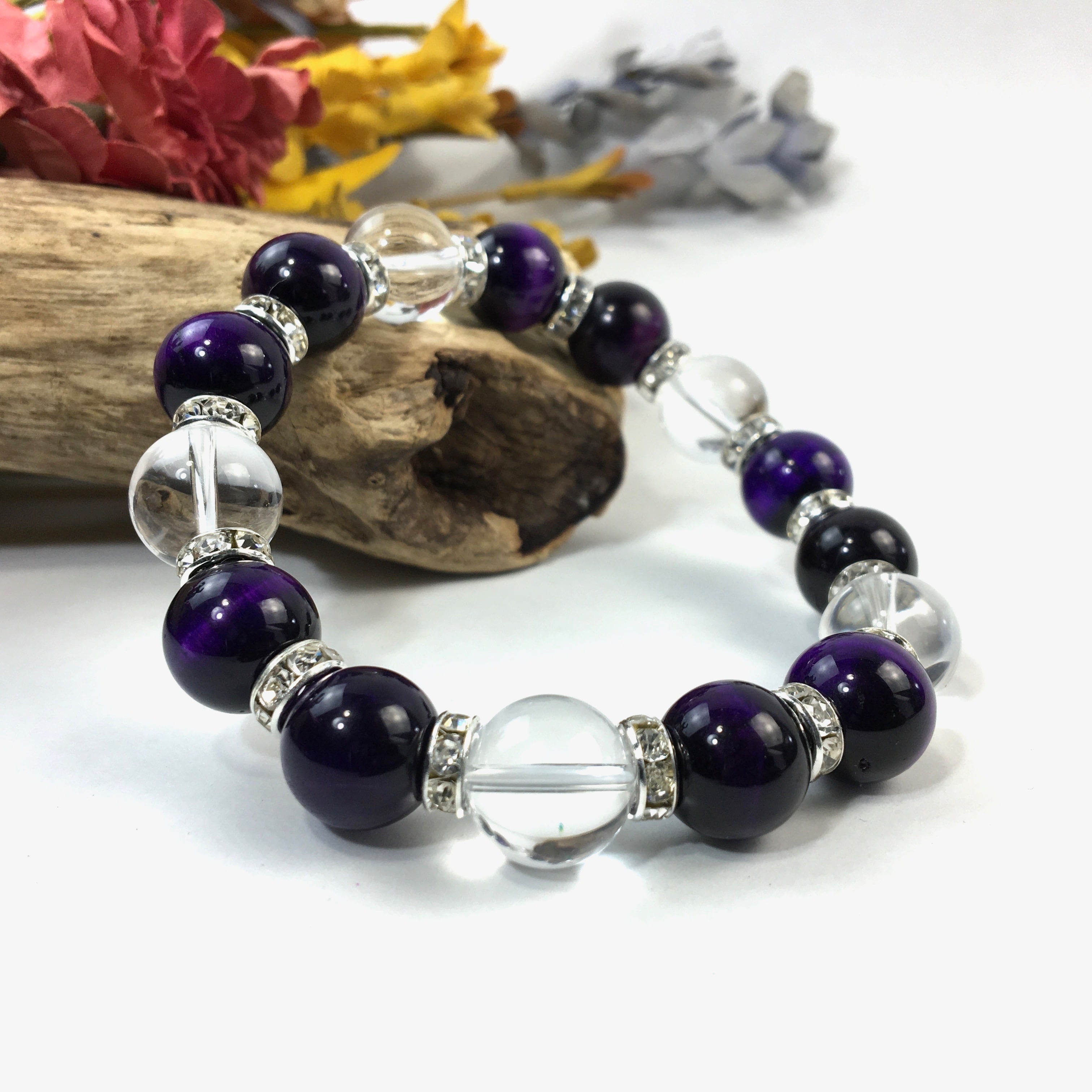 パープルタイガーアイ&水晶 パワーストーン ブレスレット 12mm (シルバー)メンズ・レディース 男性・女性 数珠ブレス 開運 ☆