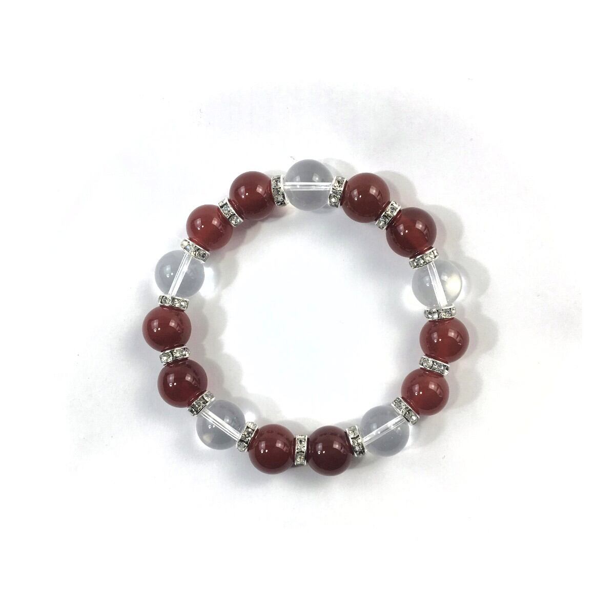 こちらは、赤瑪瑙と水晶を組み合わせたパワーストーンブレスレットです。間にはロンデルを挟み高級感あるデザインに仕上げております。石大きさは12mm玉を使用して内周約18cmです。気になる方は是非この機会にどうぞ。