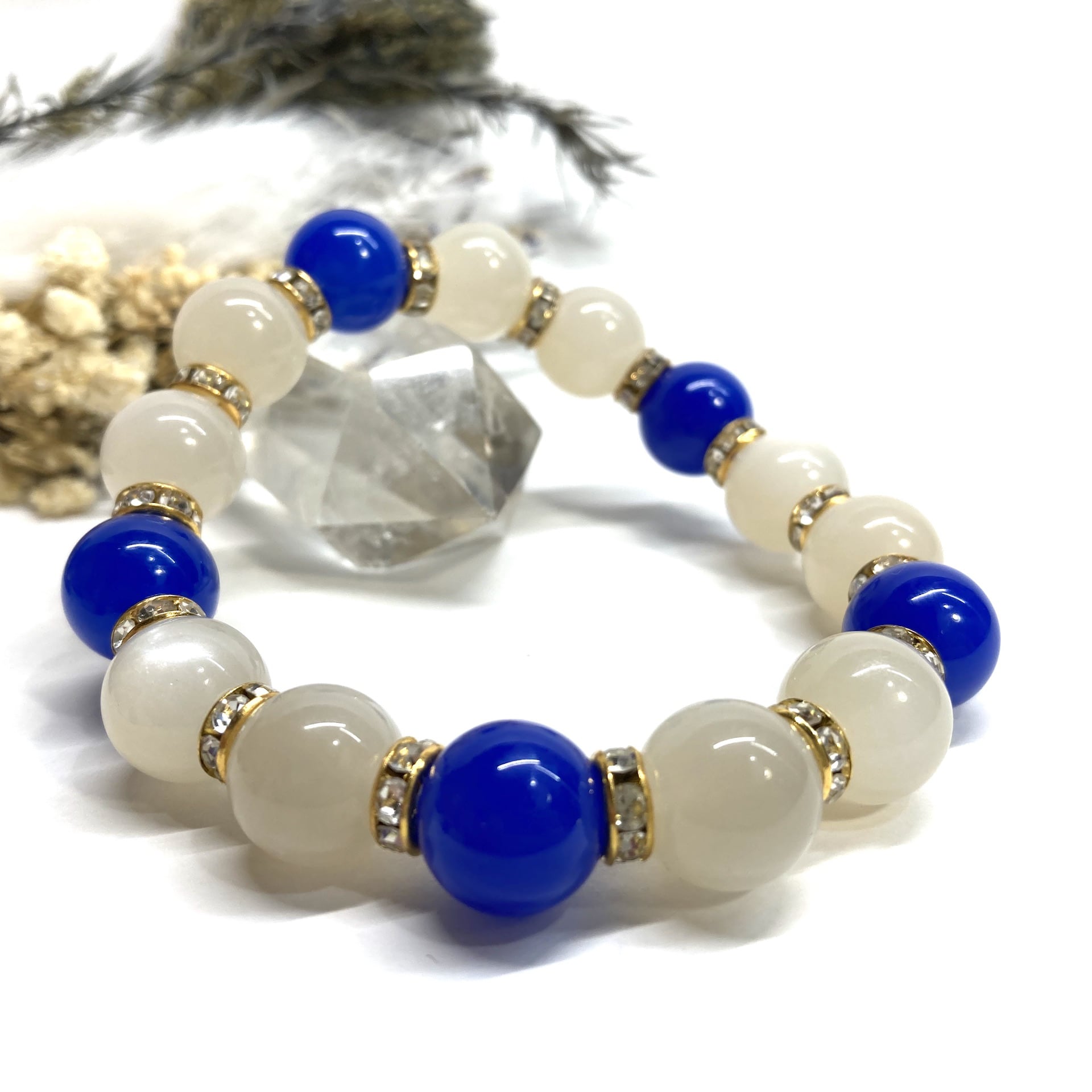 こちらは、ムーンストーンと青瑪瑙を組み合わせたパワーストーンブレスレットです。間にはロンデルを挟み高級感あるデザインに仕上げております。石大きさは12mm玉を使用して内周 約18cmです。気になる方は是非この機会にどうぞ。
