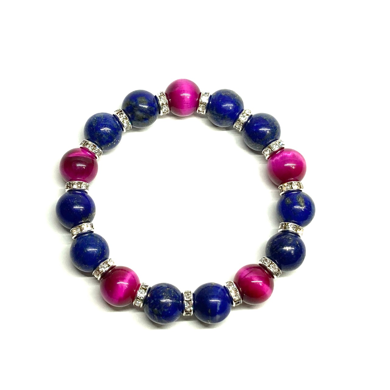 こちらは、ラピスラズリとピンクタイガーアイを組み合わせたパワーストーンブレスレットです。間にはロンデルを挟み高級感あるデザインに仕上げております。石大きさは12mm玉を使用して内周 約18cmです。気になる方は是非この機会にどうぞ。