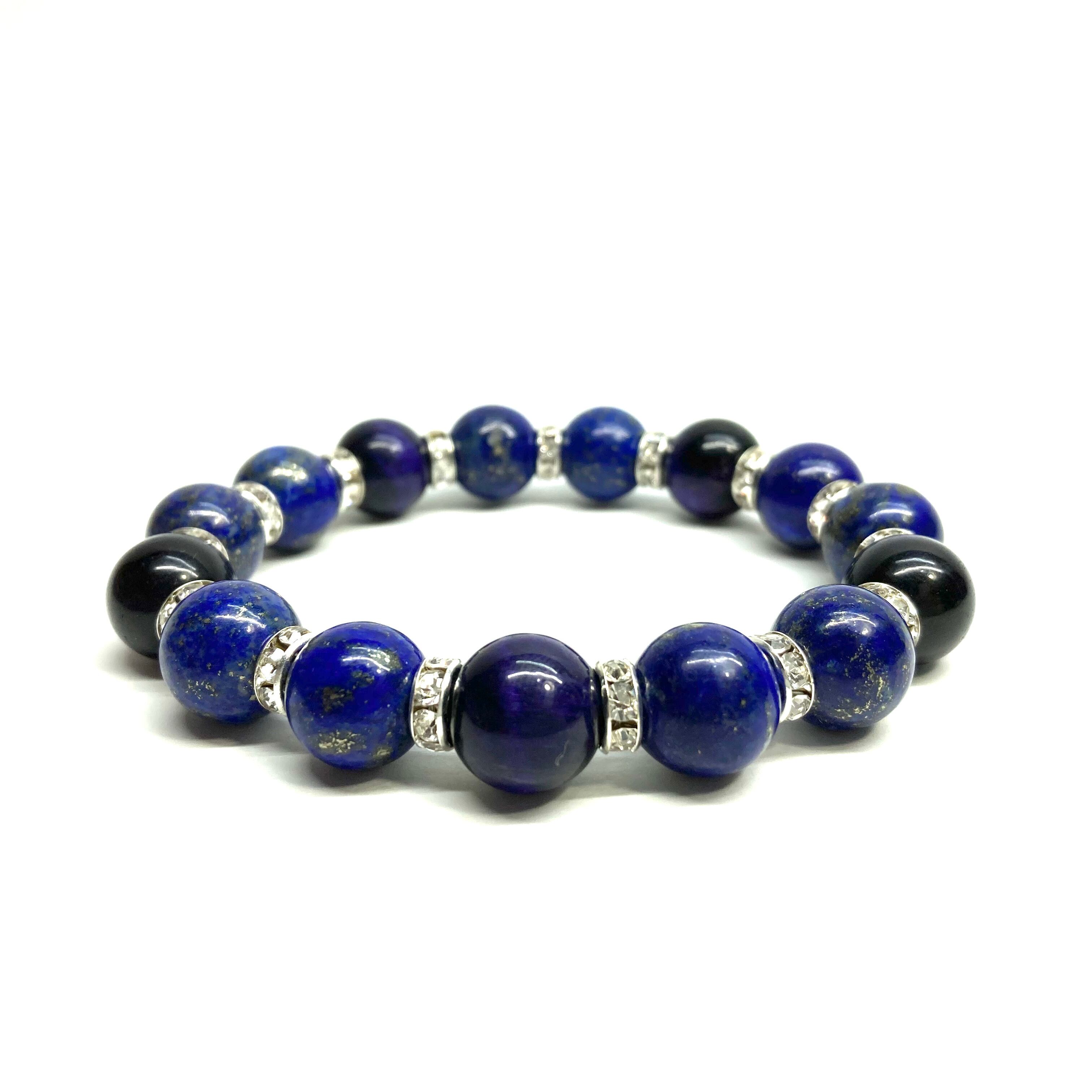こちらは、ラピスラズリとパープルタイガーアイを組み合わせたパワーストーンブレスレットです。間にはロンデルを挟み高級感あるデザインに仕上げております。石大きさは12mm玉を使用して内周 約18cmです。気になる方は是非この機会にどうぞ。