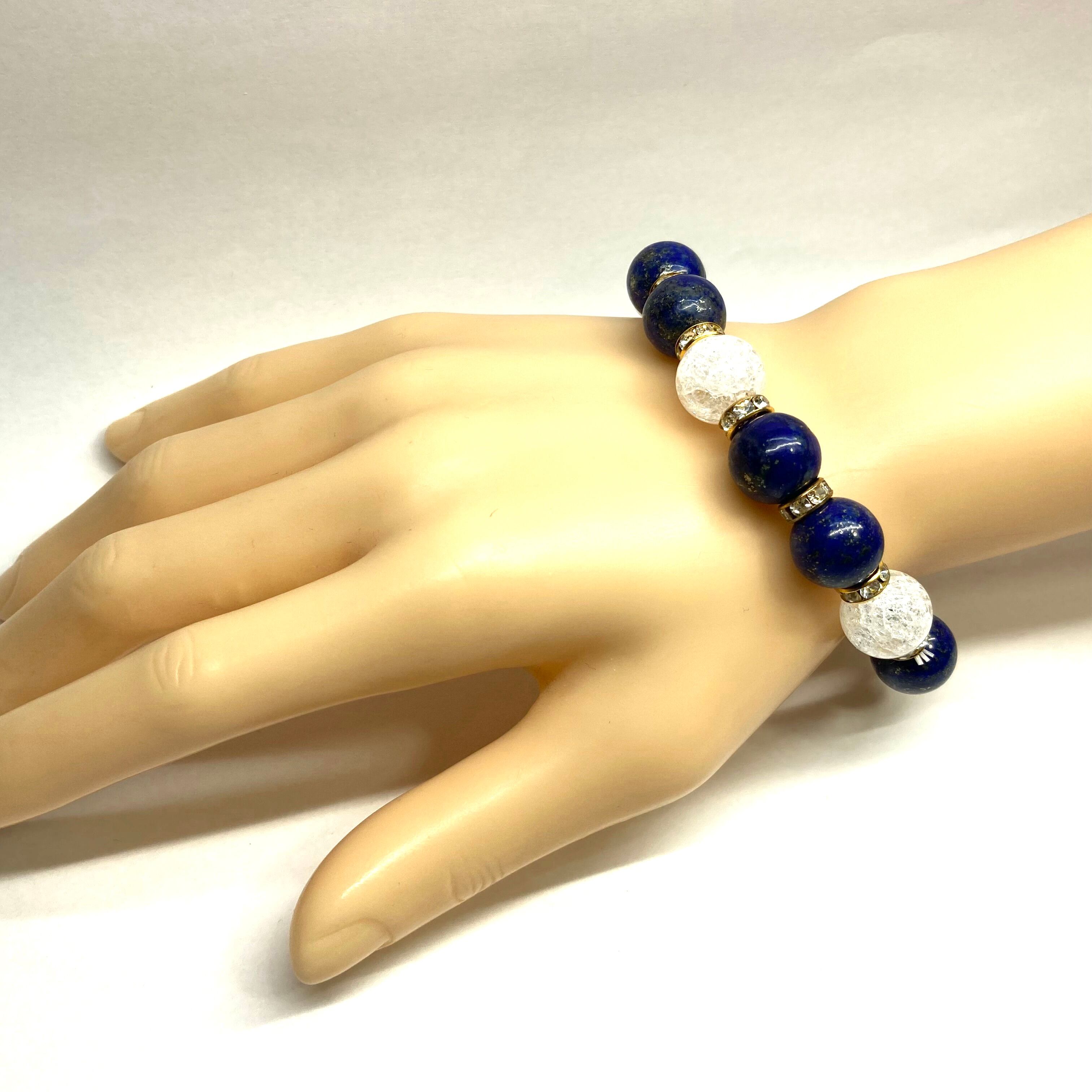こちらは、ラピスラズリとクラック水晶を組み合わせたパワーストーンブレスレットです。間にはロンデルを挟み高級感あるデザインに仕上げております。石大きさは12mm玉を使用して内周 約18cmです。気になる方は是非この機会にどうぞ。