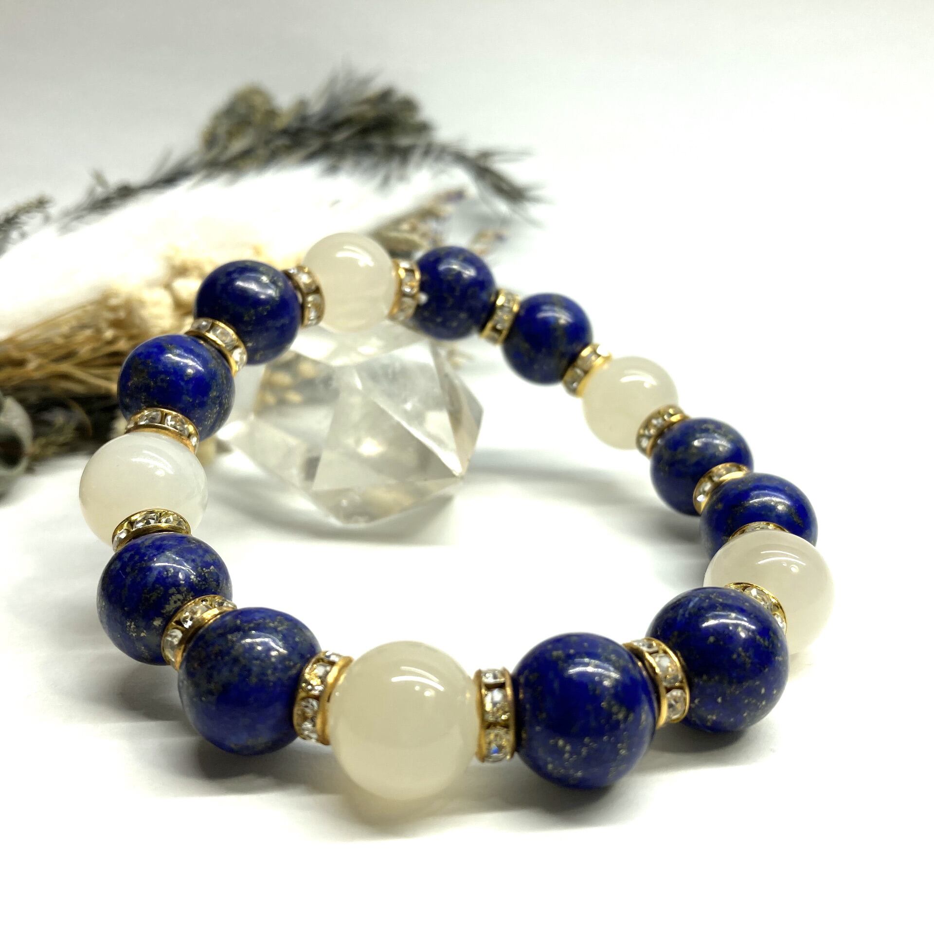こちらは、ラピスラズリとムーンストーンを組み合わせたパワーストーンブレスレットです。間にはロンデルを挟み高級感あるデザインに仕上げております。石大きさは12mm玉を使用して内周 約18cmです。気になる方は是非この機会にどうぞ。