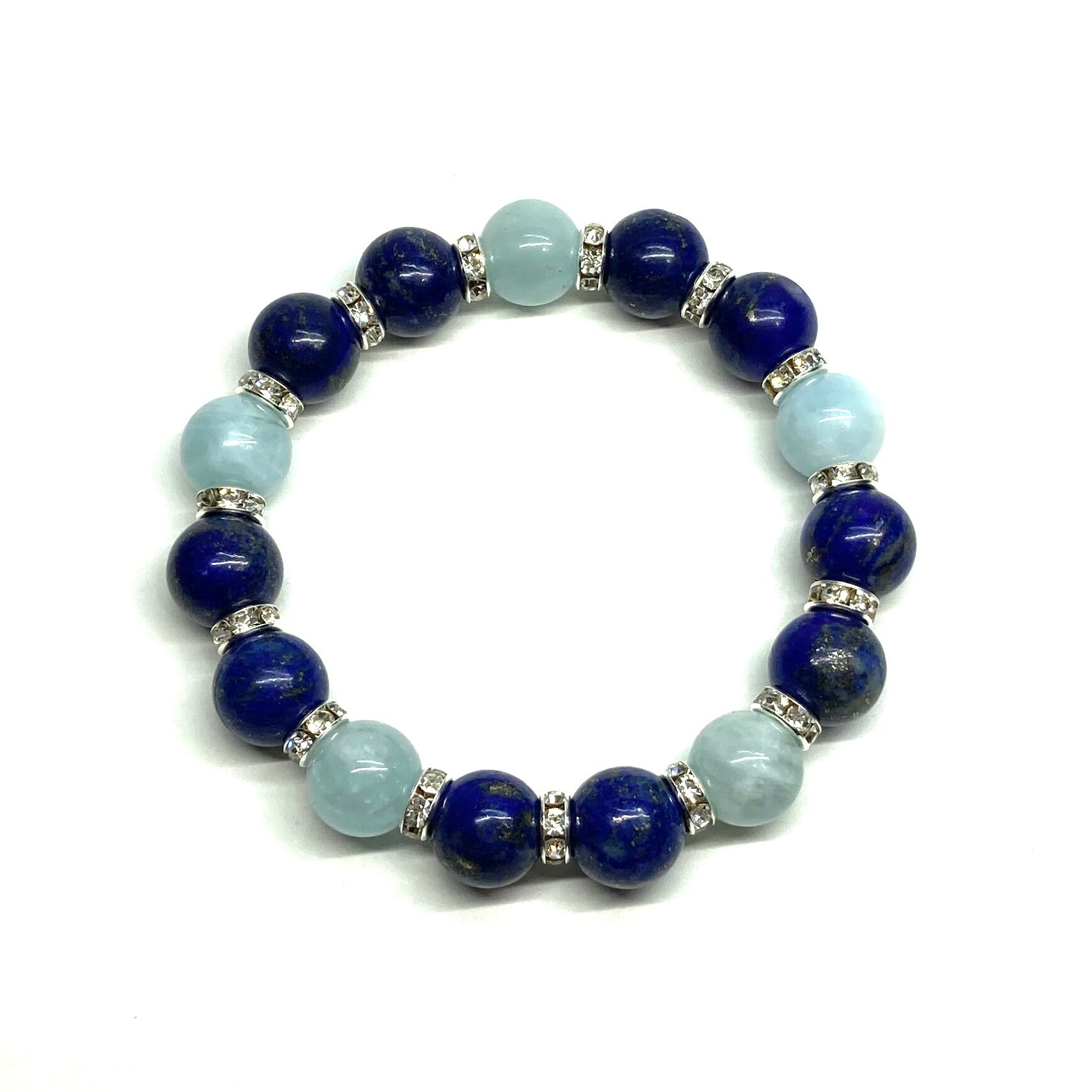 こちらは、ラピスラズリとアクアマリンを組み合わせたパワーストーンブレスレットです。間にはロンデルを挟み高級感あるデザインに仕上げております。石大きさは12mm玉を使用して内周 約18cmです。気になる方は是非この機会にどうぞ。