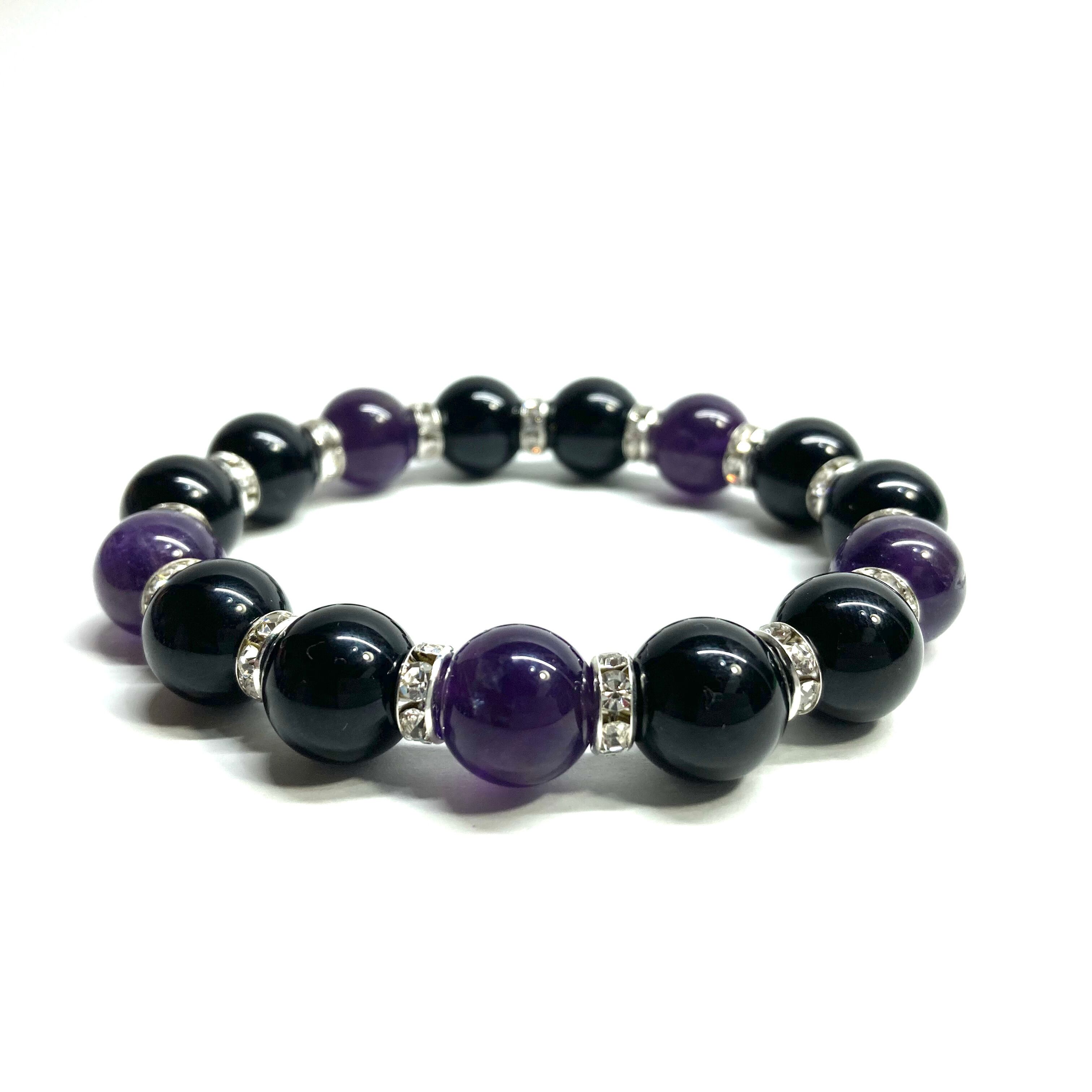 こちらは、モリオンとアメジストを組み合わせたパワーストーンブレスレットです。間にはロンデルを挟み高級感あるデザインに仕上げております。石大きさは12mm玉を使用して内周 約18cmです。気になる方は是非この機会にどうぞ。