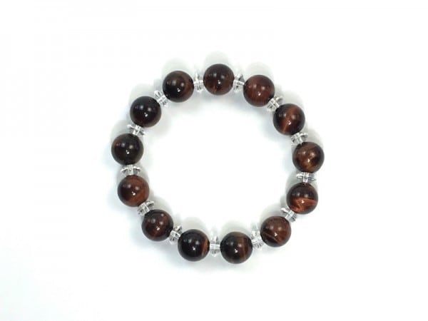 こちらは、レッドタイガーアイを使用したブレスレットです。間には水晶ソロバンが挟まれてアクセントとなっております。石大きさは腕にも馴染みやすいように12mm玉で内周約17cm(伸可能)です。気になる方は是非この機会にどうぞ。