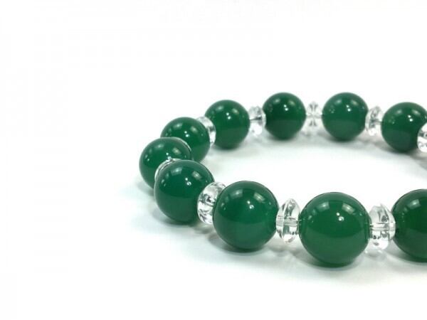 こちらは、緑瑪瑙を使用したブレスレットです。間には水晶ソロバンが挟まれてアクセントとなっております。石大きさは腕にも馴染みやすいように12mm玉で内周約17cm(伸可能)です。気になる方は是非この機会にどうぞ。