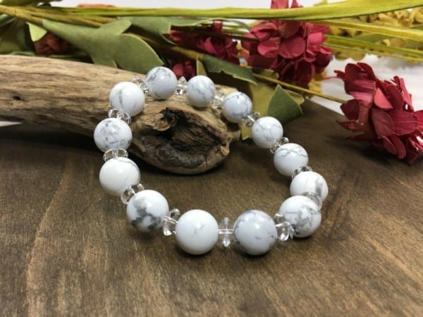こちらは、ハウライトを使用したブレスレットです。間には水晶ソロバンが挟まれてアクセントとなっております。石大きさは腕にも馴染みやすいように12mm玉で内周約17cm(伸可能)です。気になる方は是非この機会にどうぞ。