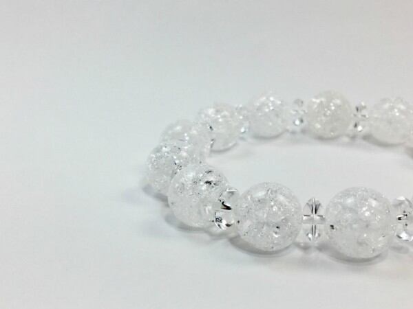 こちらは、クラック水晶を使用したブレスレットです。間には水晶ソロバンが挟まれてアクセントとなっております。石大きさは腕にも馴染みやすいように12mm玉で内周約17cm(伸可能)です。気になる方は是非この機会にどうぞ。