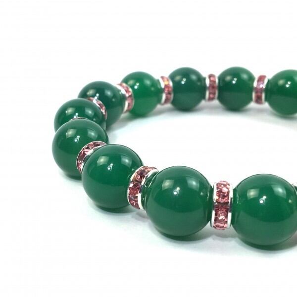 こちらは、12mm玉の緑瑪瑙を使用した天然石ブレスレットです。石との間にはロンデルを挟み高級感を演出しています。シンプルなデザインですのでどんなコーディネートとも合わせ易いブレスレットです。石大きさは12mm玉です。。内周約18cmです。気になる方は是非この機会にどうぞ。